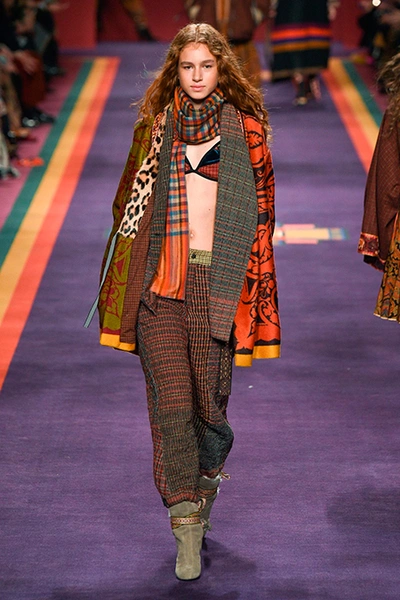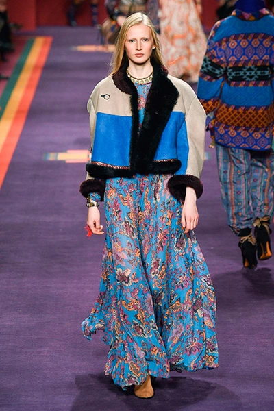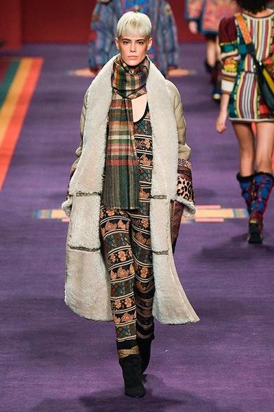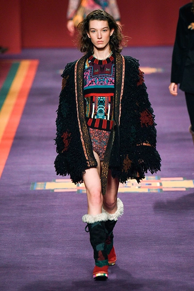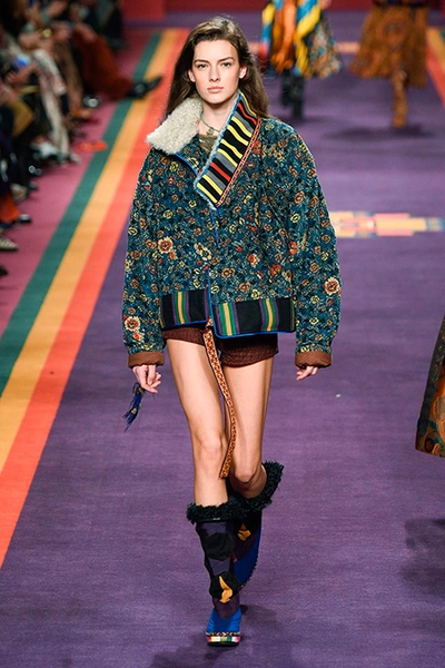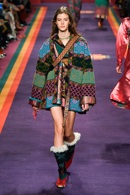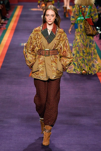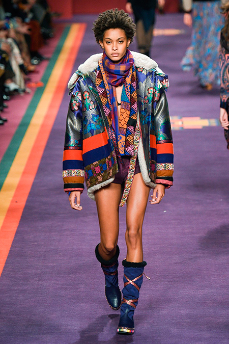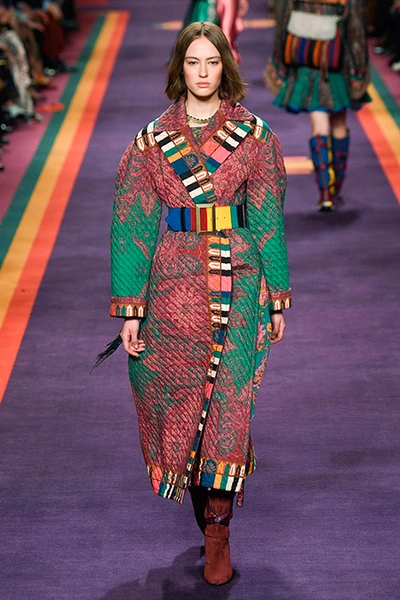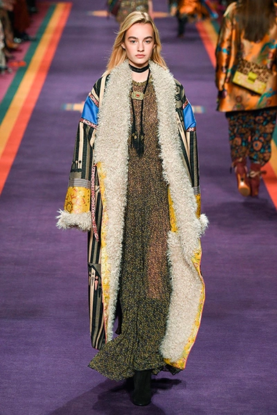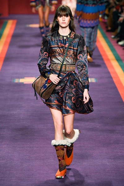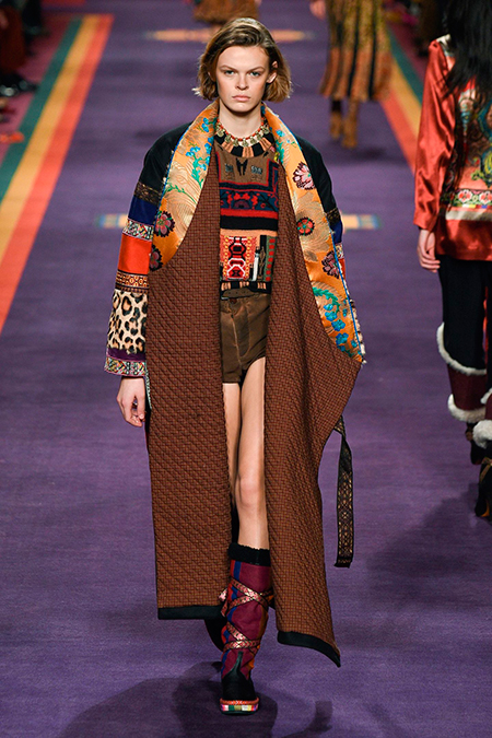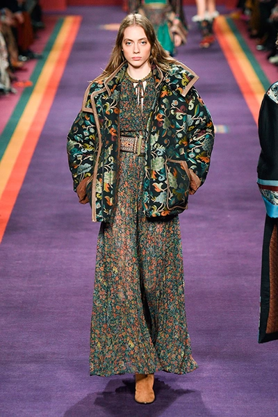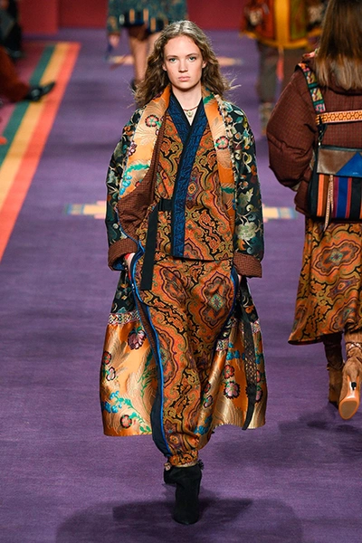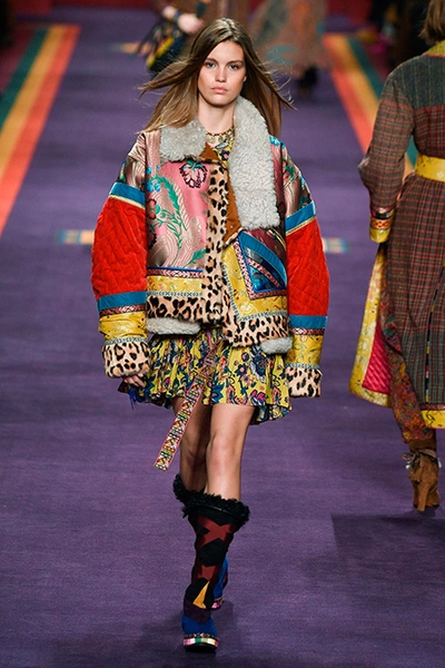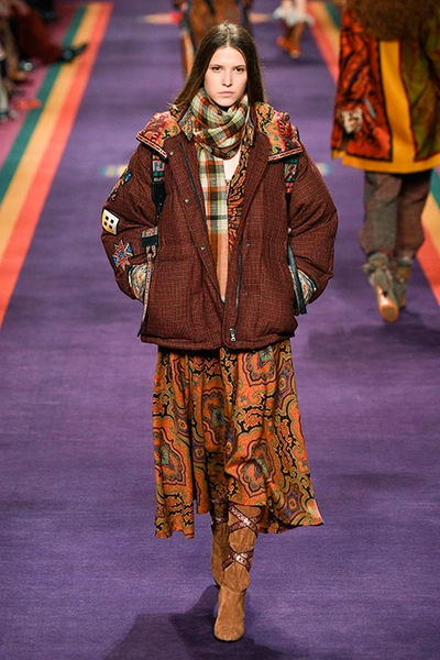 Верные своему ДНК в принтах, Etro поразили красотой шелковых платьев, пуховиками-телогрейками, дубленками и теплой обувью в стиле пэчворк. Я сразу вспомнила Королевство Бутан - единственную в мире страну, в которой есть министерство счастья. И где живут самые счастливые на свете люди.