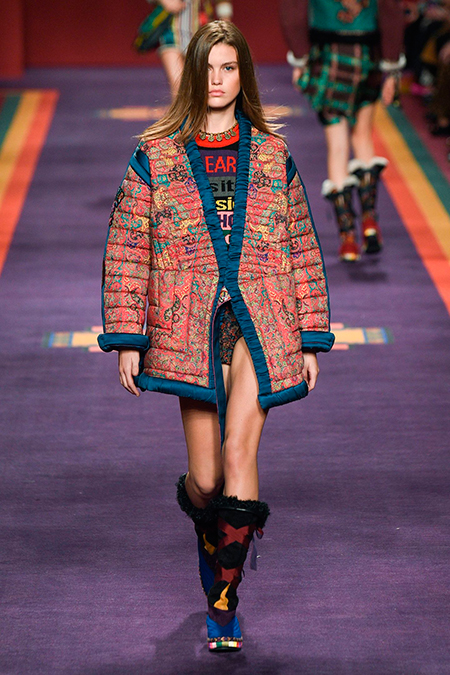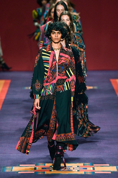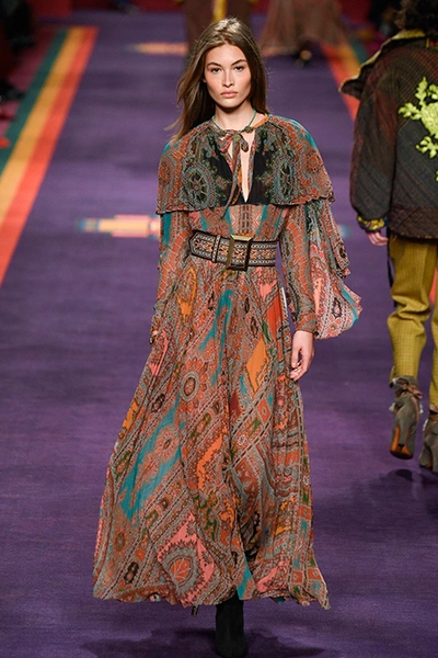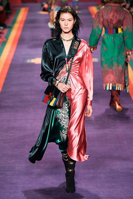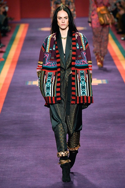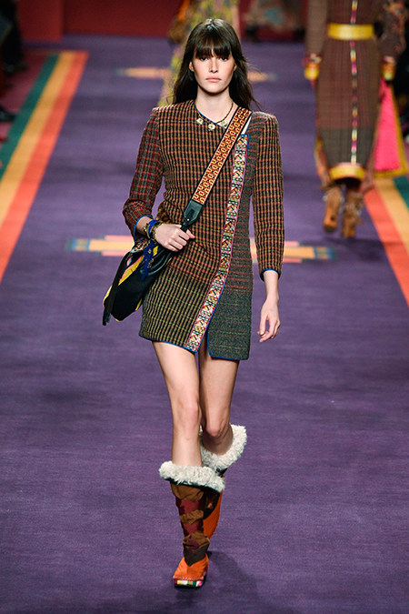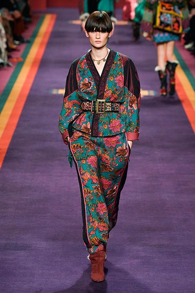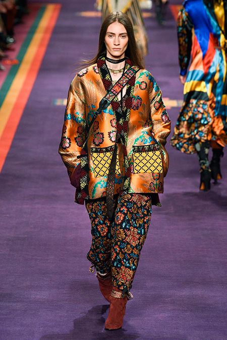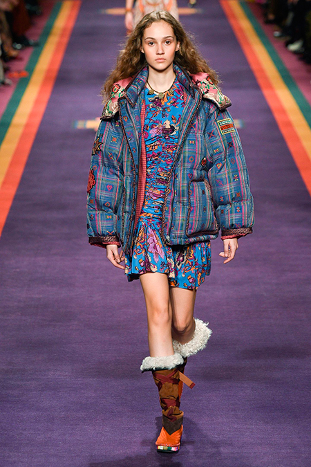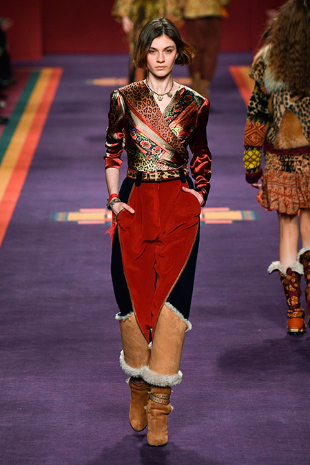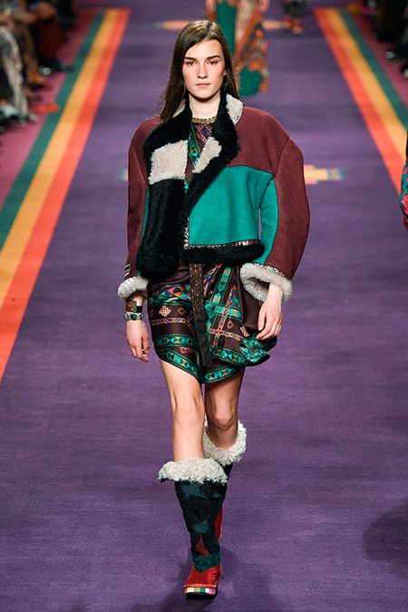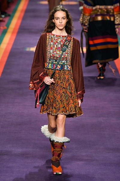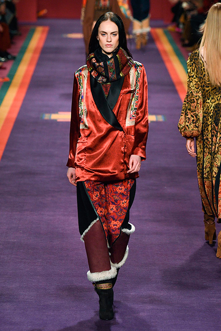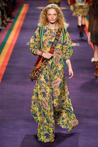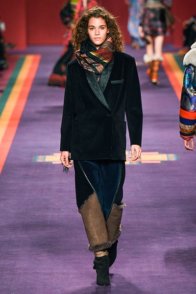 Верные своему ДНК в принтах, Etro поразили красотой шелковых платьев, пуховиками-телогрейками, дубленками и теплой обувью в стиле пэчворк. Я сразу вспомнила Королевство Бутан - единственную в мире страну, в которой есть министерство счастья. И где живут самые счастливые на свете люди.