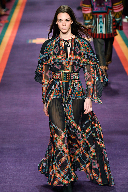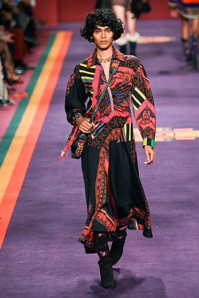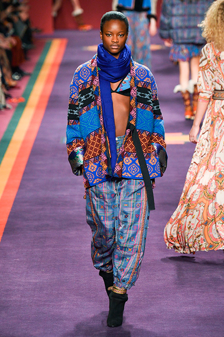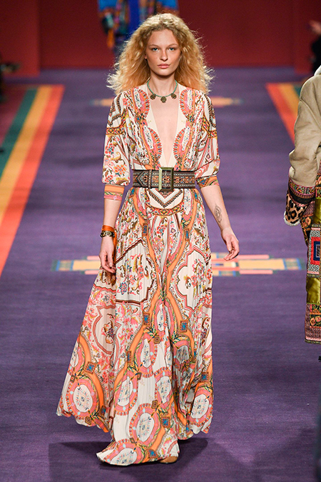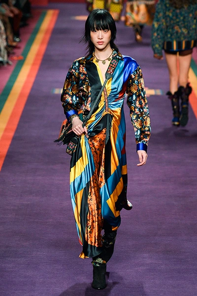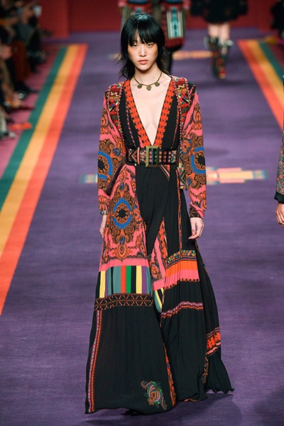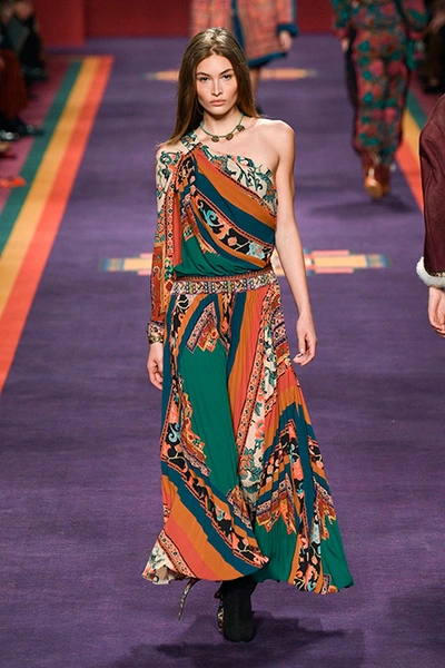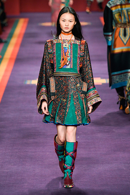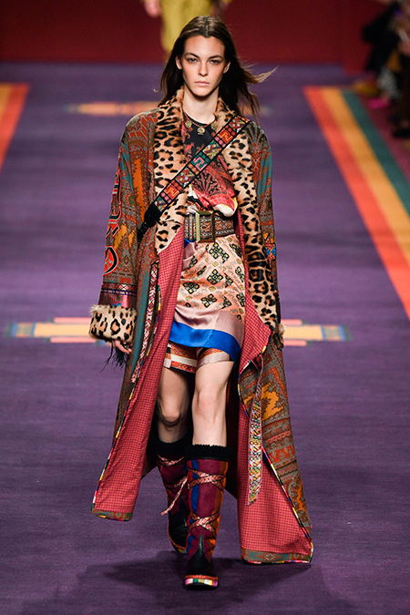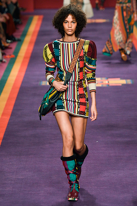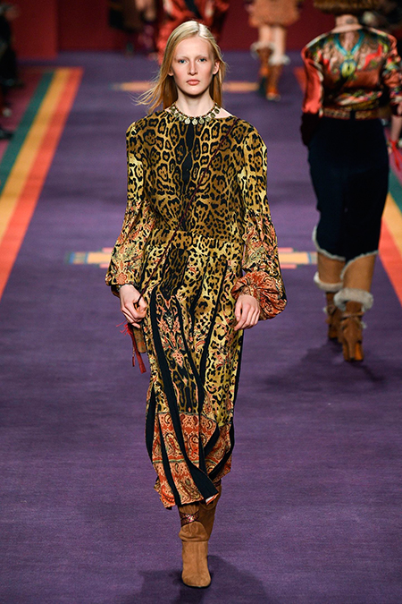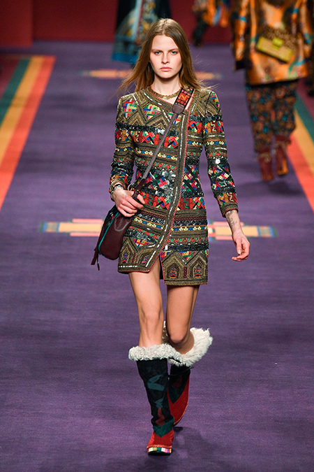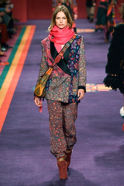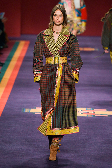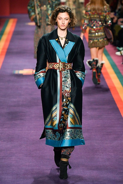Верные своему ДНК в принтах, Etro поразили красотой шелковых платьев, пуховиками-телогрейками, дубленками и теплой обувью в стиле пэчворк. Я сразу вспомнила Королевство Бутан - единственную в мире страну, в которой есть министерство счастья. И где живут самые счастливые на свете люди.