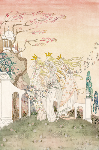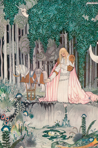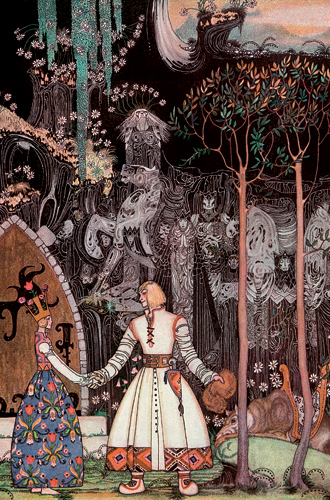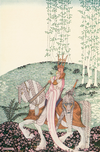 Над Кайзером годы совершенно не властны, наоборот, творческой энергии у него становится все больше, а его источники вдохновения – все более энциклопедичны и разнообразны. Отправной точкой действительно стала волшебная сказка, точнее, книга 1914 года издания East of the Sun and West of the Moon («На восток от Солнца, на запад от Луны»). Это название одного северного норвежского предания – причудливой версии нашей сказки «Маша и медведь», только с троллями, роскошными деталями и нарядами, проиллюстрированной датским фантазером Каем Нильсеном. В конце норвежская «Маша» обзаводится принцем (им оказался тролль), становится принцессой и живет долго и счастливо. Эта героиня изображена на спине одного пальто из коллекции. Кстати, показ Карл так и назвал – «Легенды и сказки».