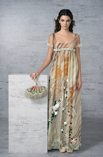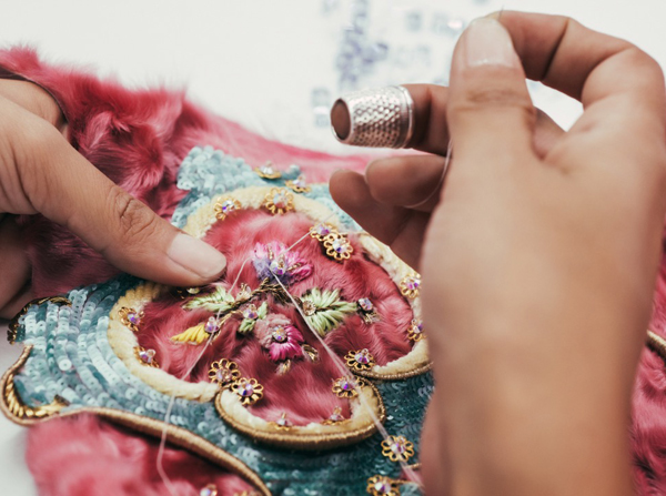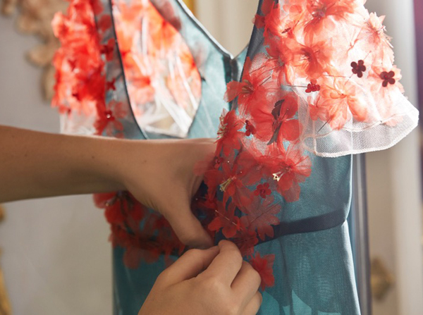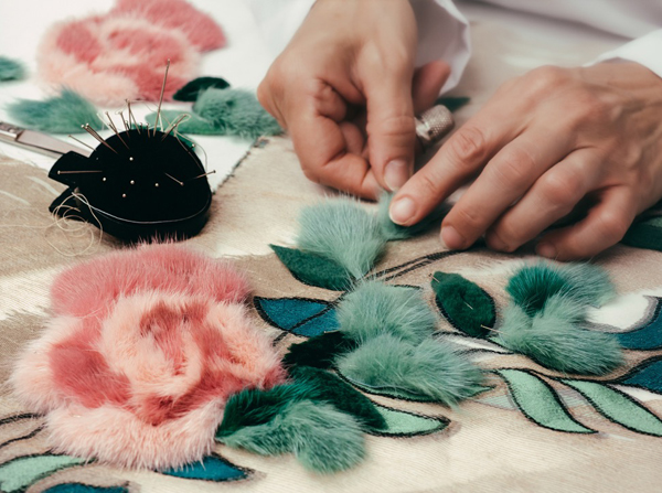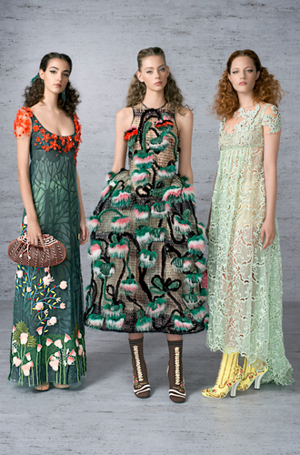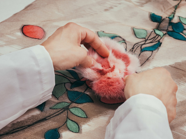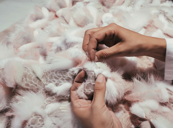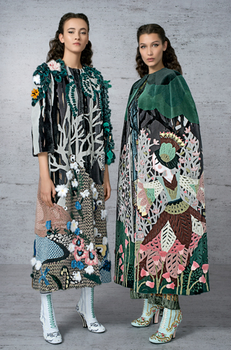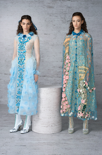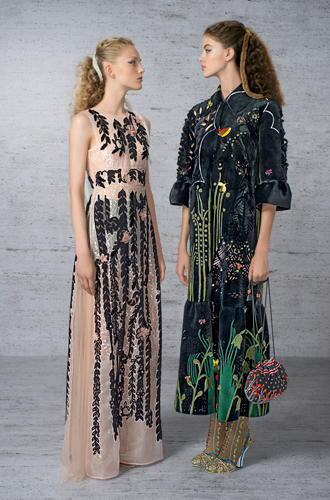 5 тысяч вырезанных вручную отверстий превратили розовый каракуль в кружево для макси-платья. Отделка микроскопическими фрагментами из меха норки, своеобразная мозаика, изображает волшебную сценку в лесу. Тюлевые платья расшиты небольшими деталями из меха с длинным ворсом, кружевные – украшены аппликацией, цветами ручной работы из стриженой норки.