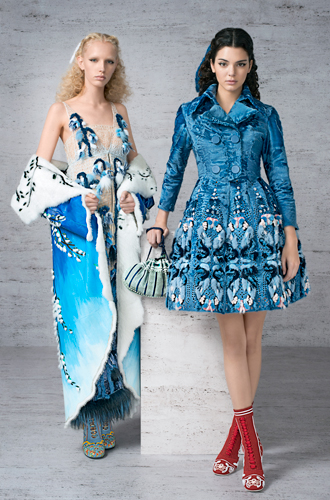 Есть еще мохеровые платья-паутинки, материал которых больше всего похож на оренбургский пуховый платок, только с распустившимися 3D-цветами, платья и пальто с пейзажами и эпическими многофигурными композициями и голубое пальто (на фотографии слева) для первого выхода на показе Кендалл Дженнер, с перфорацией квадратиками и хитроумным паттерном. И все это – тончайшие меховые коллажи, которые иначе как чудом не назовешь. На самом же деле за всей этой красотой стоят дни и недели кропотливого труда. Так, на склеивание той самой лесной сценки ушло 1200 часов работы специалистов из мастерских модного Дома.