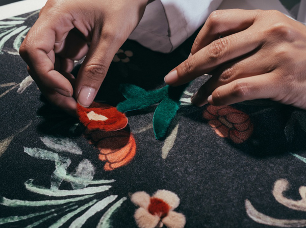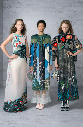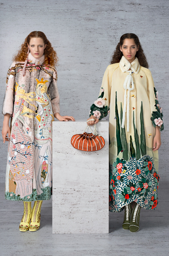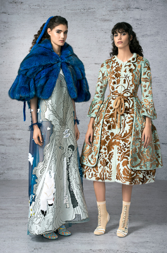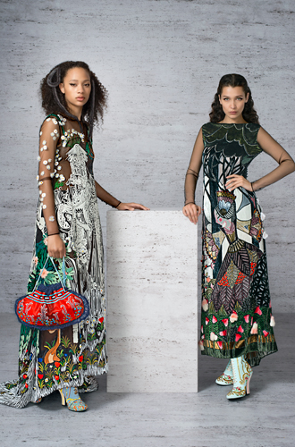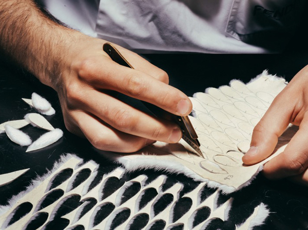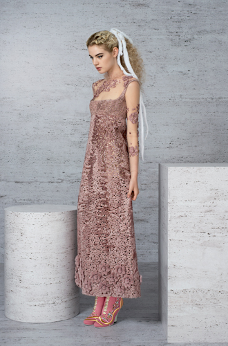 5 тысяч вырезанных вручную отверстий превратили розовый каракуль в кружево для макси-платья. Отделка микроскопическими фрагментами из меха норки, своеобразная мозаика, изображает волшебную сценку в лесу. Тюлевые платья расшиты небольшими деталями из меха с длинным ворсом, кружевные – украшены аппликацией, цветами ручной работы из стриженой норки.