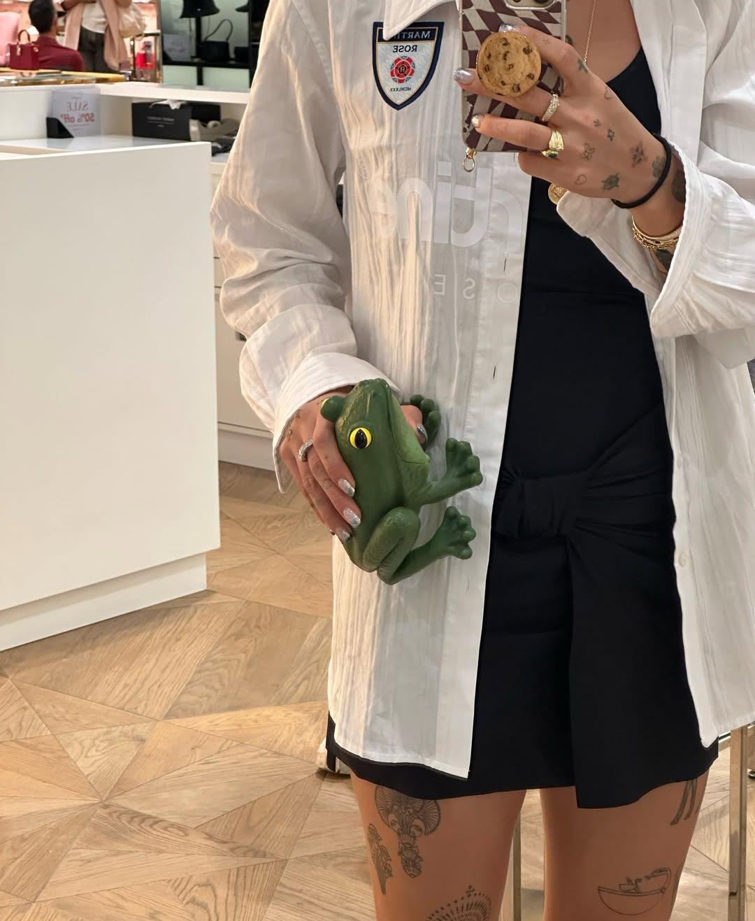 Отдельная слабость Пегги — мини и микро-сумки, которые она сама честно называет «такими маленькими и такими бесполезными» — и при этом признается, что именно ими особенно одержима. В ее социальных сетях практически ежедневно появляются мини-модели: от Louis Vuitton до ироничной лягушки JW Anderson.