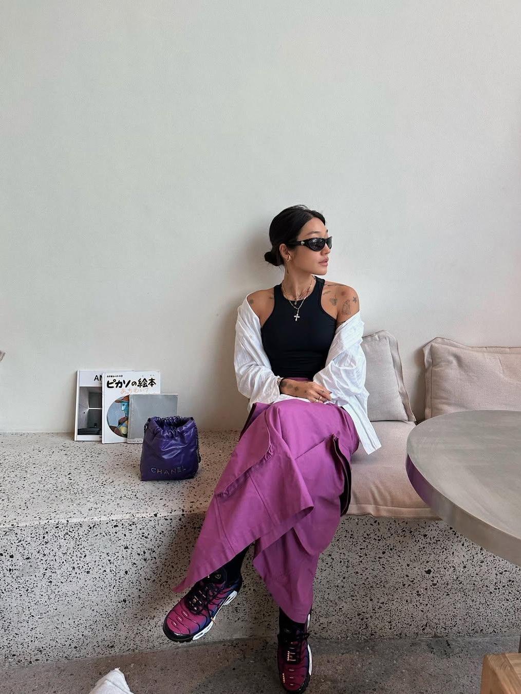 В другой день в ход идет неоновая мини 2.55, которая мгновенно снимает с легендарной модели, руки Габриэль Шанель, ореол «правильной леди» и делает ее частью современной моды. А на Гран-при F1 в Абу-Даби Пегги вышла с культовой Chanel 22, но даже здесь она придумала, как выделиться, и выбрала модель в фиолетовом оттенке.