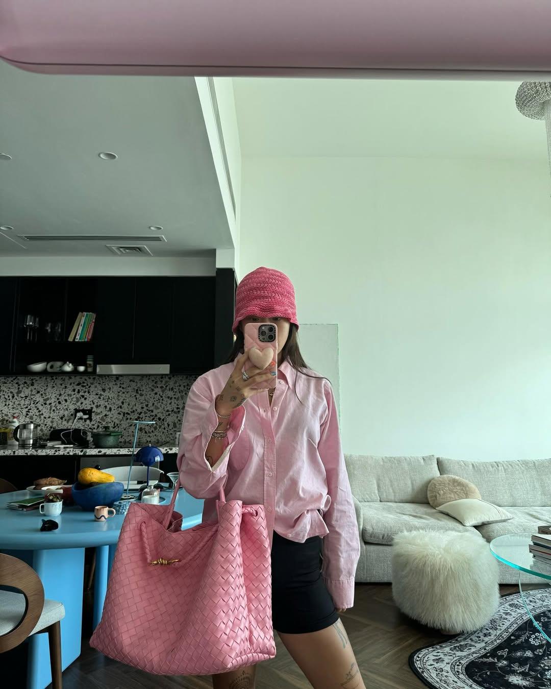 В повседневных выходах Пегги умело играет с пропорциями: стилизует крупную нежно-розовую Andiamo с фирменным плетением intrecciato с максимально простыми образами, а потом может увеличить громкость — надеть драматичную макси-сумку с гипер-феминным корсетом и массивными украшениями. Для нее Bottega — это совсем не тихая роскошь, а главный акцент образов, который она сознательно выводит на первый план.