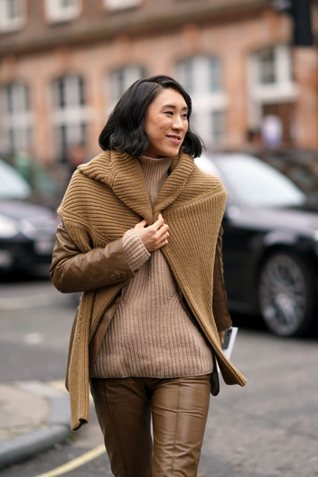 Прием, который особенно полюбился модным инфлюенсерам этой осенью. Самое бюджетное дополнение гардероба — взять трикотажный свитер и повязать на одно или оба плеча поверх пальто — получается более свежая, но не менее функциональная альтернатива шарфу.