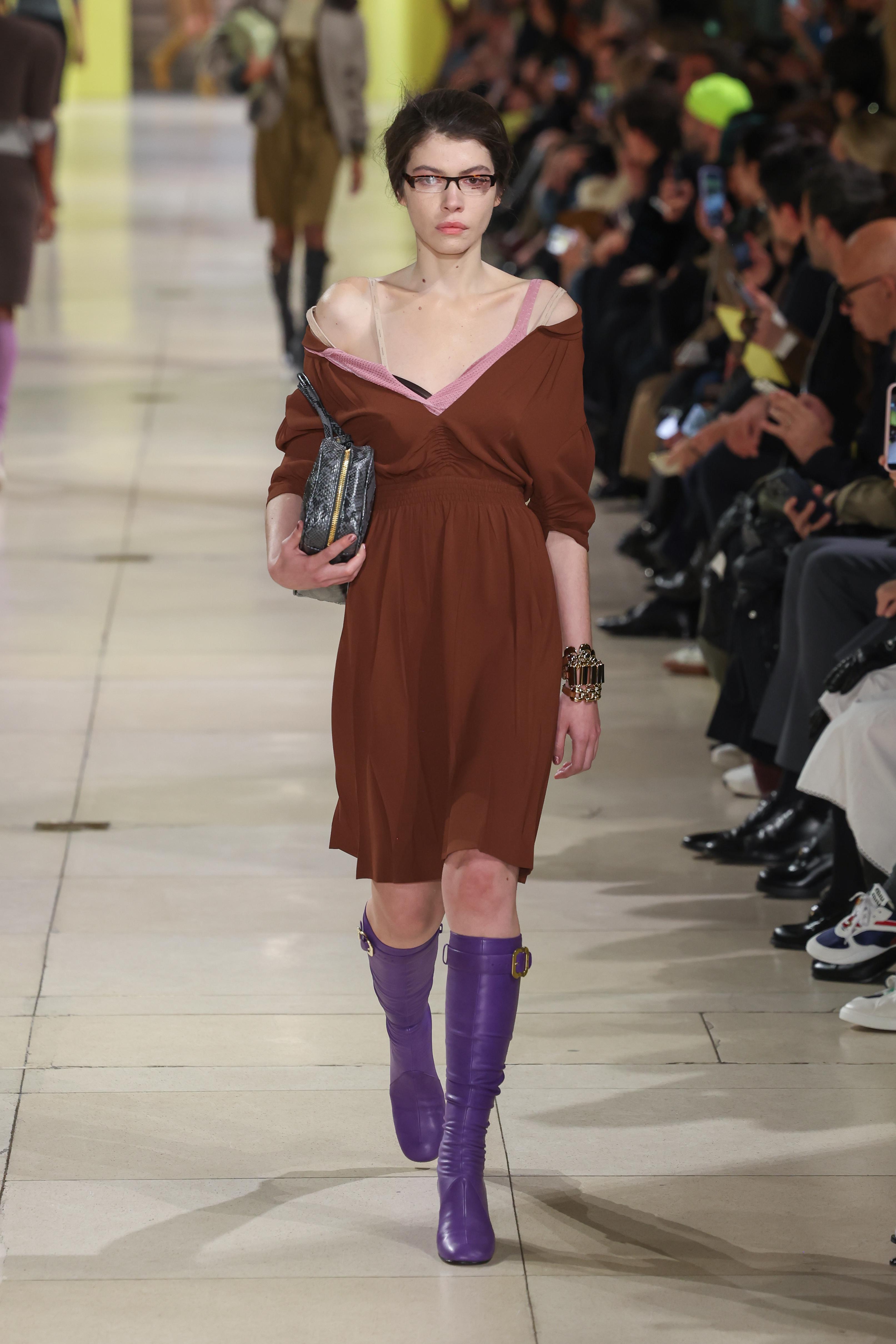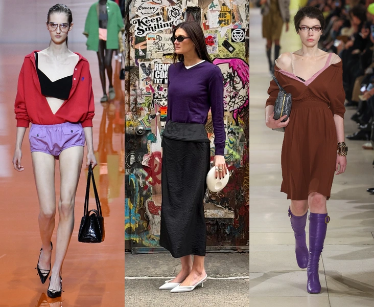 В коллекциях Miu Miu фиолетовый используется смелее — от кожаных ансамблей до экспериментов в сочетании с красным, что уже активно подхватывают стритстайл-звезды. Пара фиолетовых колготок или кожаный плащ в этом оттенке постепенно превращаются в любимый прием модных инфлюенсеров.