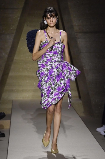 Если многие бренды по-прежнему осторожничают и запускают фиолетовый в коллекциях в виде аккуратных акцентов, Chloé демонстративно доводят тему до максимума. В показах Дома появляются несколько цельных total-look’ов в фиолетовой гамме — от летящих платьев до продуманных костюмных ансамблей, дополненных монохромными аксессуарами. Это всегда важный сигнал: когда креативный директор выводит оттенок на уровень целой истории, можно смело говорить о статусе ключевого цвета сезона.