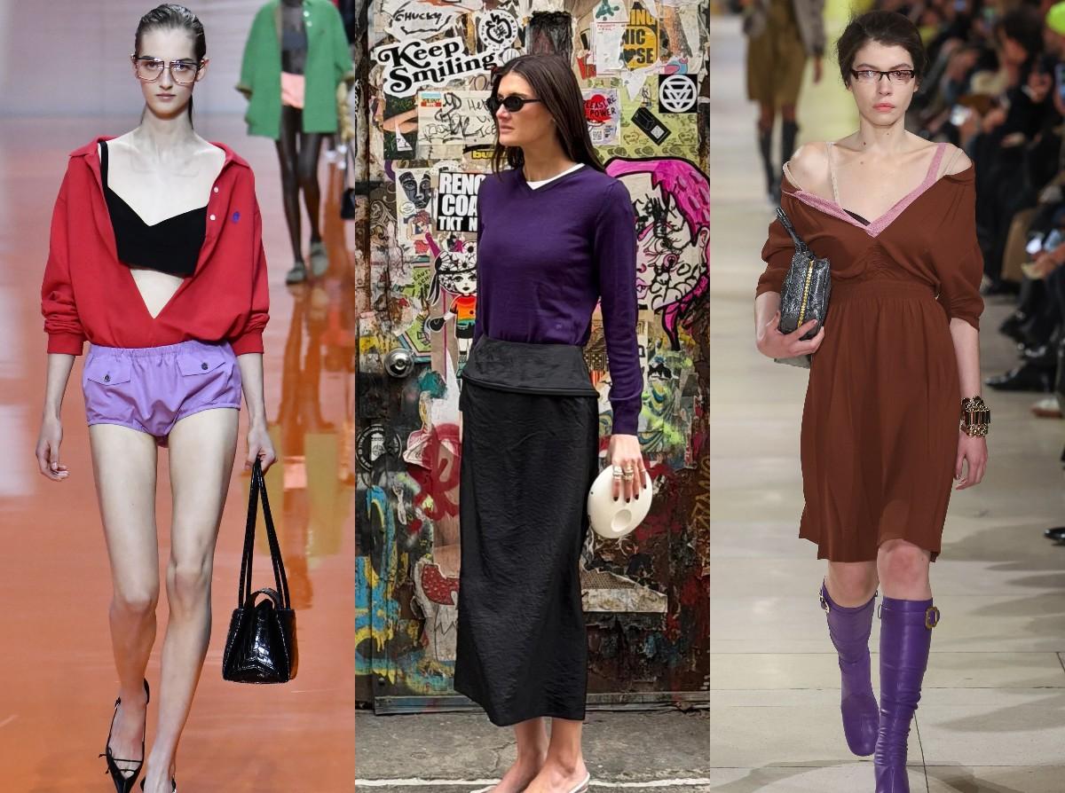Если вы пока не готовы к крупным фиолетовым вещам, начните с деталей. На подиумах оттенок появляется и в виде колготок, и длинных перчаток, и тонких ремней, а иногда — даже в нижнем белье, которое просвечивает через юбки и топы. Но в повседневной жизни, конечно, проще всего экспериментировать с колготками, ремнем, шелковым платком или сумкой.