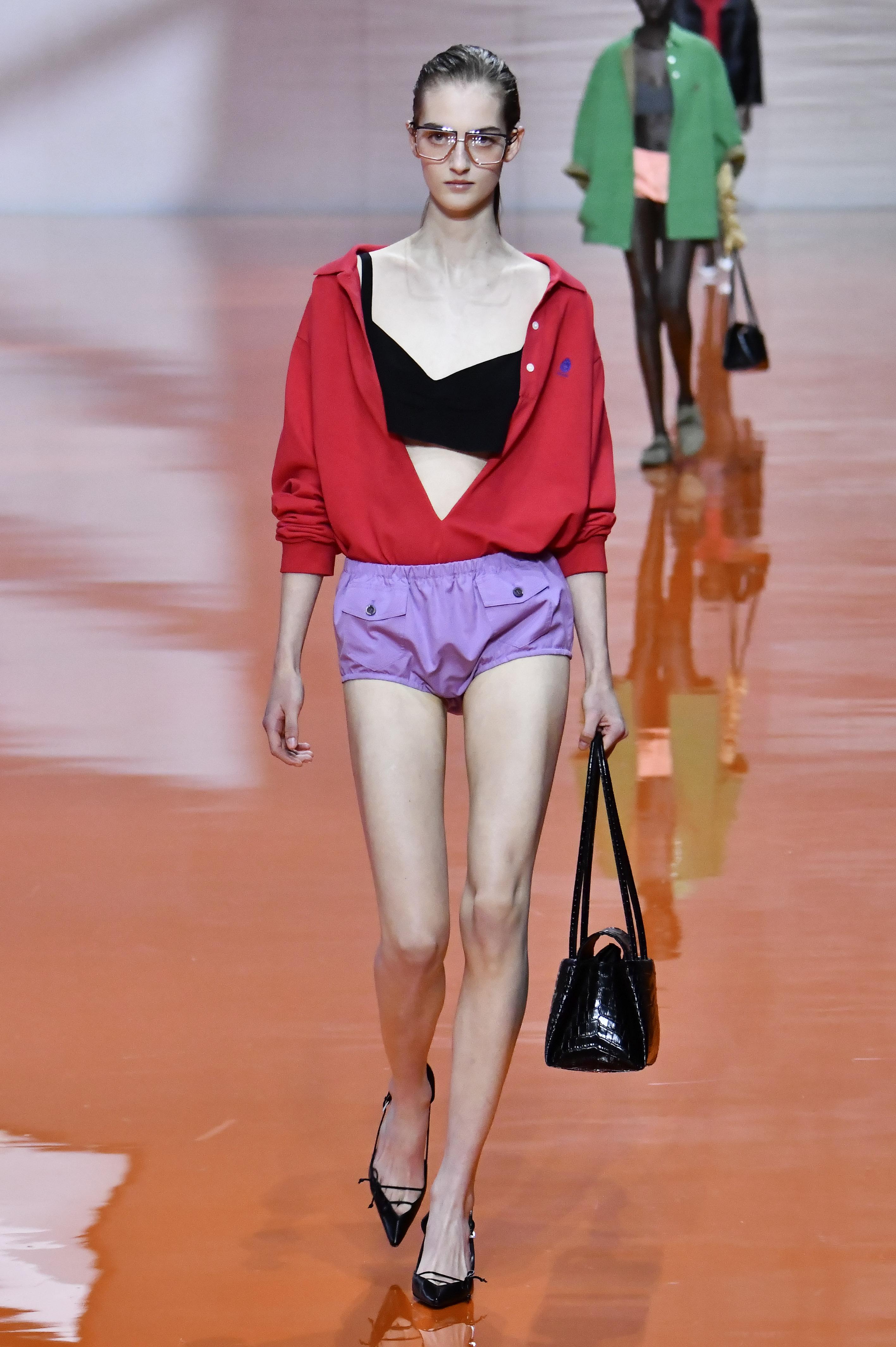 У Prada фиолетовый часто появляется в формате «неочевидного базового» — это лаконичные топы, платья и шорты, вписанные в привычную для бренда палитру серого, черного и оливкового. За счет сложного оттенка одежда выглядит как интеллектуальное продолжение гардероба, а не как одноразовый трендовый вброс.