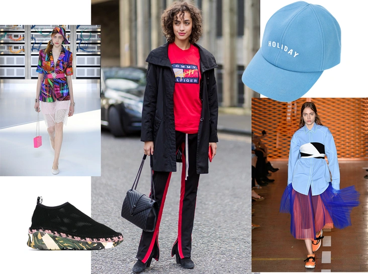 В любой, даже очень далекий от спорта, образ можно добавить тематический намек с помощью аксессуаров. Самые очевидные и универсальные – кроссовки и бейсболки. И если первые мы уже давно и без сомнений надеваем практически со всем, то вторые по-прежнему задействуем максимально осторожно. Между тем сочетать кепки с пиджаками классического кроя, вдохновившись веселыми 90-ми, не побоялся даже сам Карл Лагерфельд.