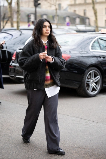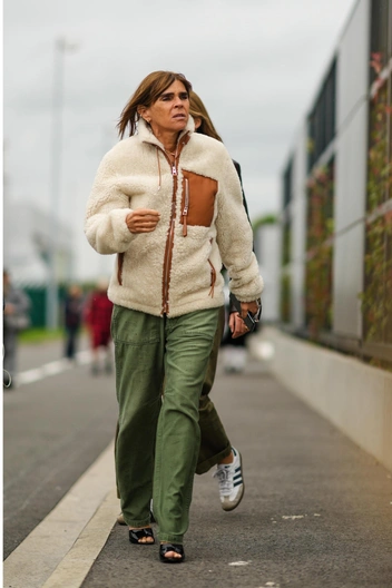 Базовый гардероб и флиска. Сочетайте флисовую толстовку или анорак с классическими прямыми брюками, джинсами свободного кроя или оливковыми карго, как бывший главный редактор французского Vogue — Карин Ройтфельд. Выбирайте нейтральные или глубокие оттенки: графит, молочный, бордовый (читайте также: Идеальная база — брюки на осень-зиму 2025/26: лучшие модели у российских брендов).