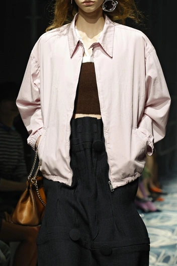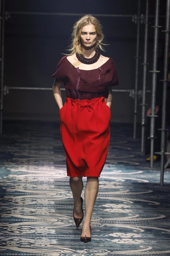Например, сеньора Прада вывела модель в темной юбке и топе (A+A), которые дополнила нейтральным нежно-розовым бомбером (B). Или надела на одну из девушек джемпер бордового цвета и юбку красного (A+A) и дополнила темно-коричневым (B).