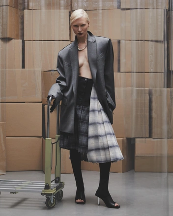 В женской линейке представлены фактурное пальто из шерсти с объемными рукавами-буфф, юбка и топ-корсет из глянцевого «жатого» лаке, платья с бахромой и мягкие брюки палаццо из шерсти, жаккардовые свитера оверсайз. Ключевой моделью стал высокотехнологичный облегченный пуховик с проявляющимся на морозе акцентным принтом.
