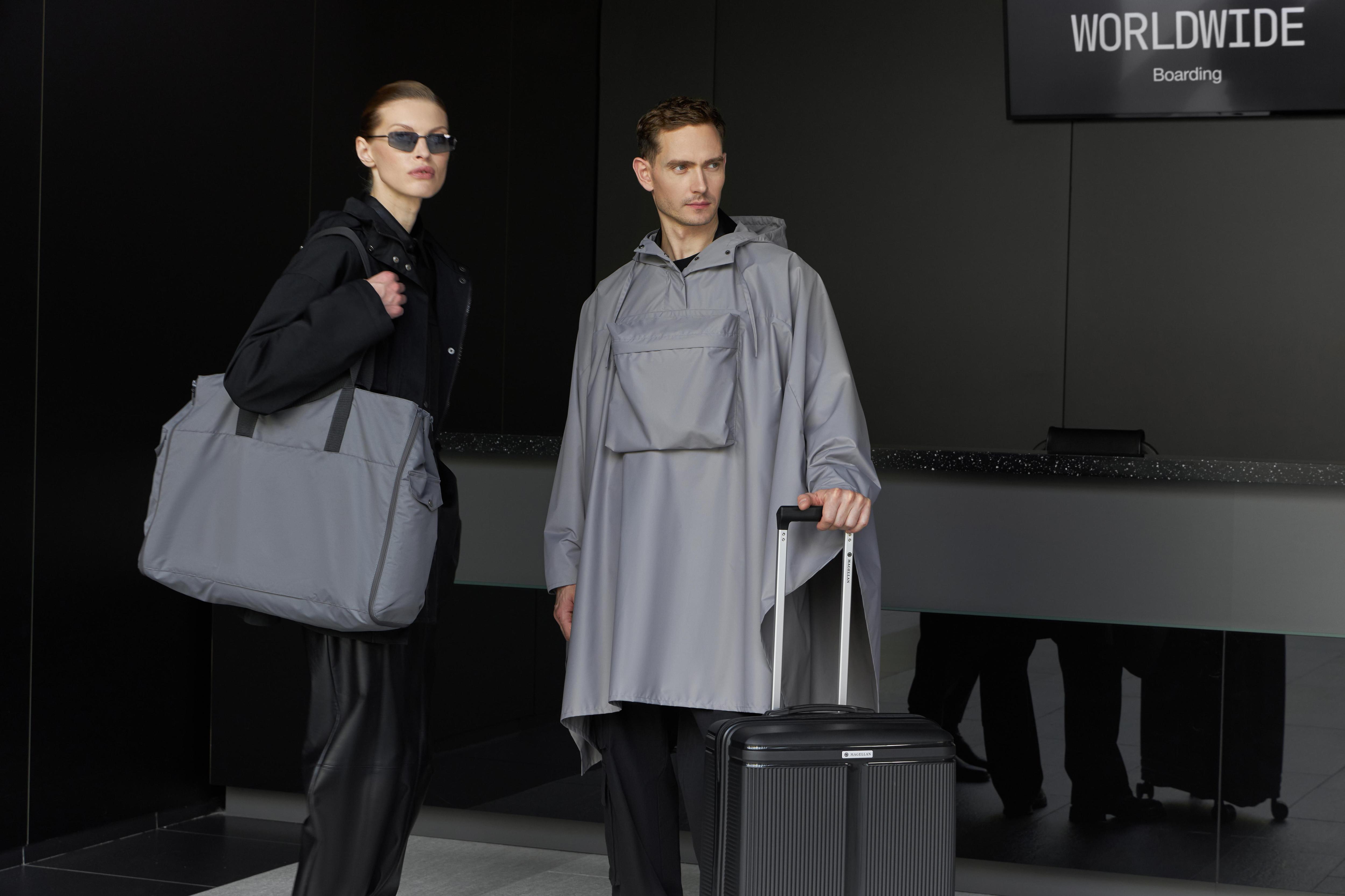 Сумка-кофр имеет вместительные накладные карманы и отстегивающиеся боковые части. Она тоже пригодится для перевозки вещей, а по прибытии на место — например, в отель, — из сумки можно собрать кофр, чтобы удобно хранить вещи. Съемный капюшон сделан из материала с водоотталкивающей пропиткой и выручит во время дождливой погоды. Дождевик в сложенном виде выглядит как небольшая сумка, а развернуть его можно за считанные секунды.