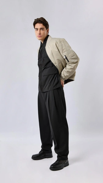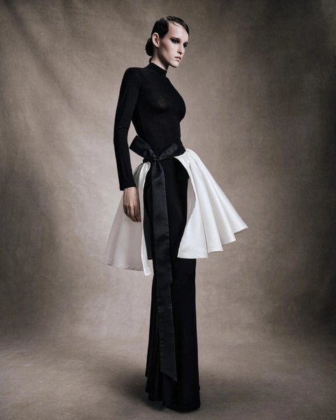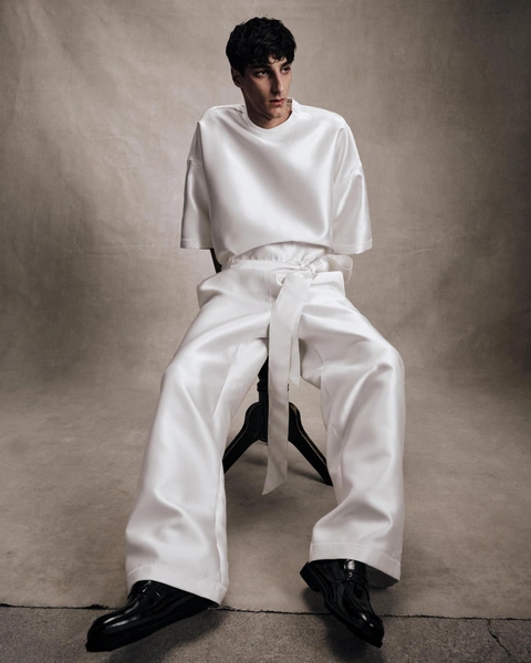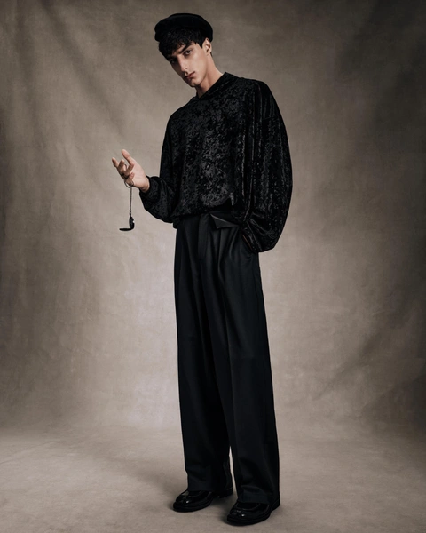 В мужской части преобладают комфортные образы из непривычных материалов. Лонгслив LVI представлен из атласа с манжетой и складками, а брюки сочетают в себе несколько контрастных материалов. В коллекции ROMAN NUMERALS работа с тканями похожа на хронику рождения и жизни этих материалов в разные эпохи. Здесь и плотная тафта, сливающаяся с тонким шёлком, и матовый блеск, перетекающий в более зеркальный на струящихся фактурах, и грубая шерсть индийской выделки.