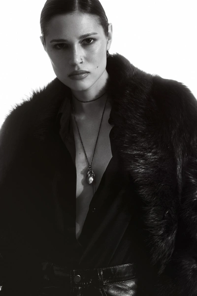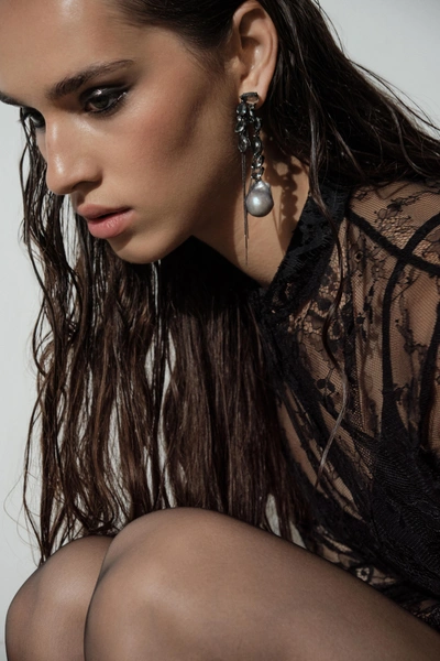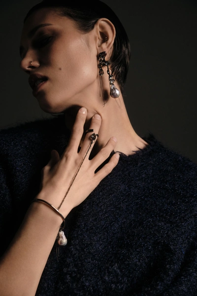 Кулон на длинной цепочке с жемчужиной, декорированный кристаллами — универсальное акцентное изделие, которое украсит как повседневный, так и праздничный образ. А самый нестандартный элемент — слейв-браслет из латуни, с дымчато-серыми кристаллами и барочным жемчугом. В этой коллаборации бренды использовали фирменный цвет камней Caviar Jewellery, барочные жемчужины невероятного серого оттенка, множество мелких цепочек и металл, покрытый черным родием. Сами украшения стали крупнее и смелее, отражая характер и энергию Rockabi.