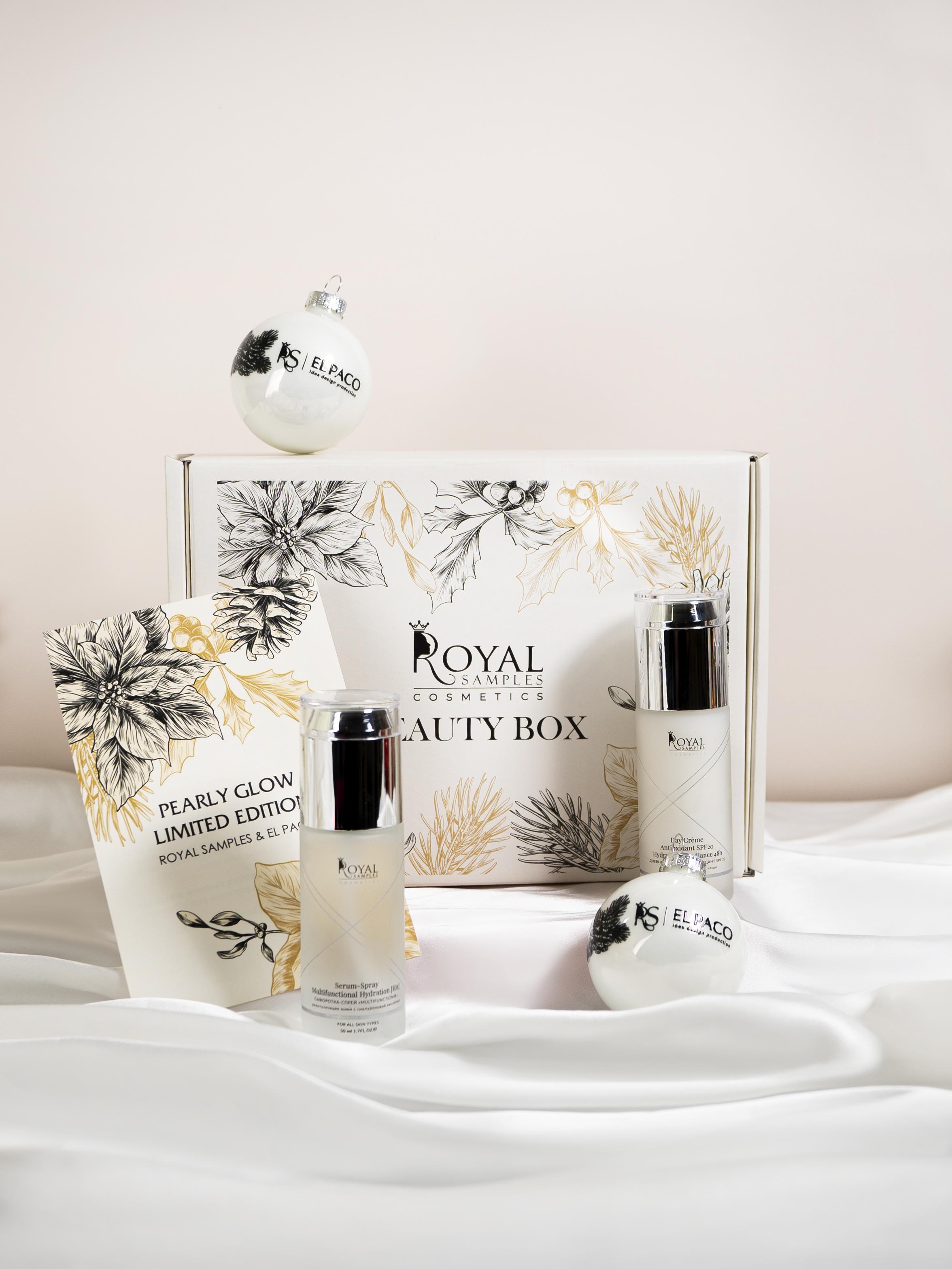 В составе «Pearly Glow Limited Edition»: дневной крем SPF 20 и сыворотка-спрей с гиалуроновой кислотой от Royal Samples, а также два елочных шара из стекла от компании El Paco. Жемчужные стеклянные шары напомнят о предвкушении звона бокалов под новогодний бой курантов, а уходовые средства Royal Samples идеально подготовят кожу к макияжу в самую сказочную ночь в году. Набор универсален и прекрасно подойдет для сестры, подруги или коллеги.