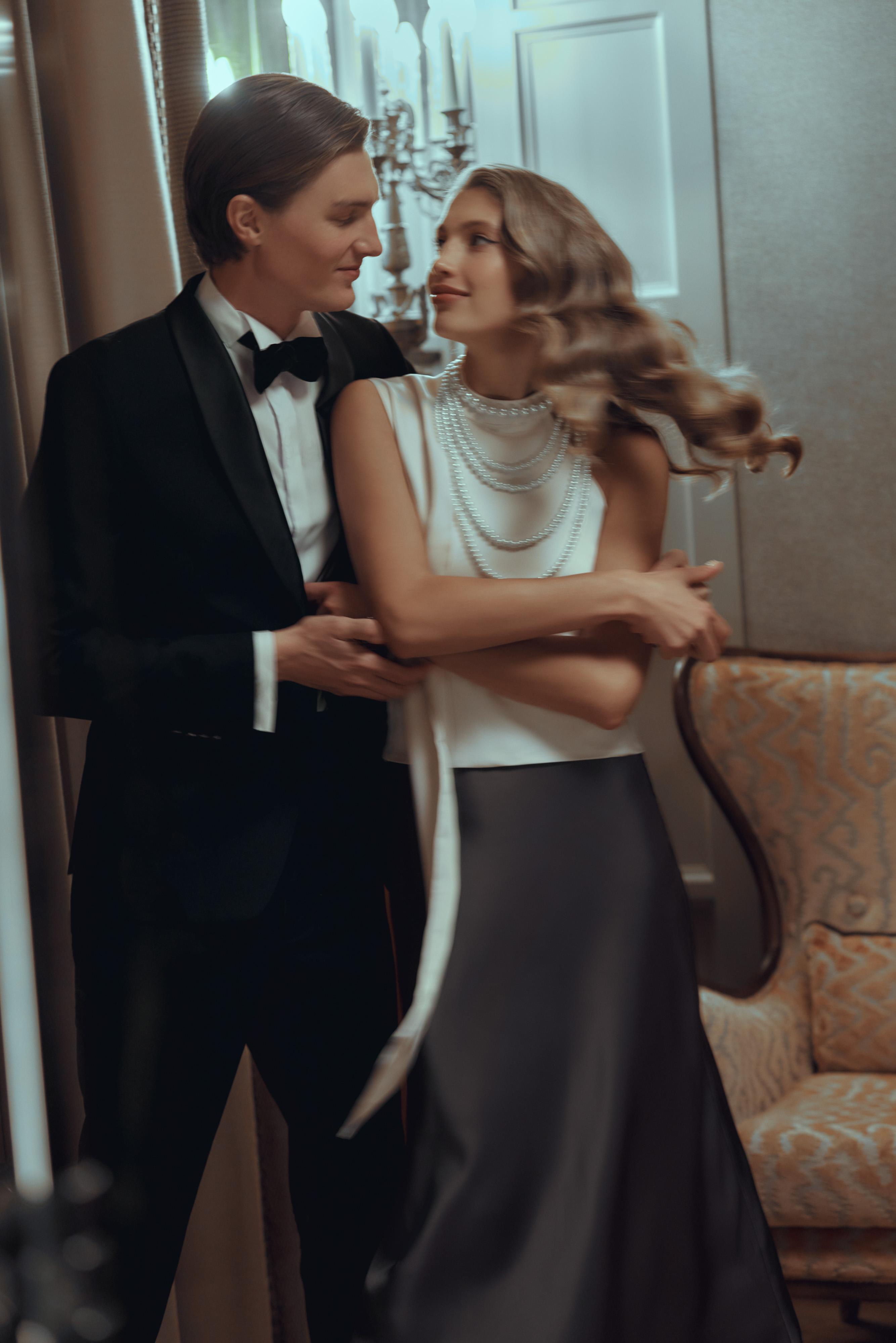 В мужской части преобладают комфортные образы из непривычных материалов. Лонгслив LVI представлен из атласа с манжетой и складками, а брюки сочетают в себе несколько контрастных материалов. В коллекции ROMAN NUMERALS работа с тканями похожа на хронику рождения и жизни этих материалов в разные эпохи. Здесь и плотная тафта, сливающаяся с тонким шёлком, и матовый блеск, перетекающий в более зеркальный на струящихся фактурах, и грубая шерсть индийской выделки.