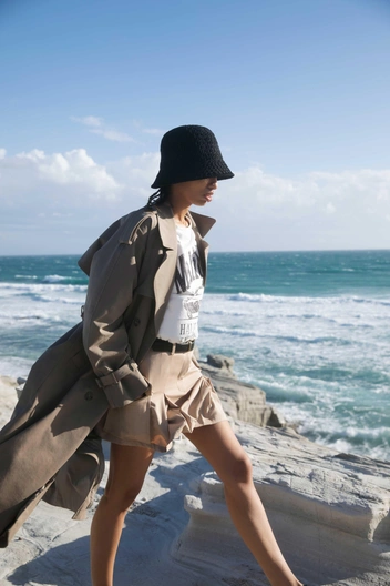 Основным материалом коллекции стал хлопок. Помимо темно-коричневого сета и платья со шнуровкой, из него выполнены мини-юбка в складку, плетеная панама кроше, футболка с принтом. Оверсайз-тренч сделан из смесового хлопка с водонепроницаемой пропиткой.