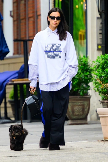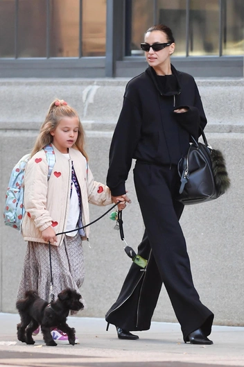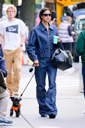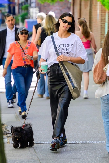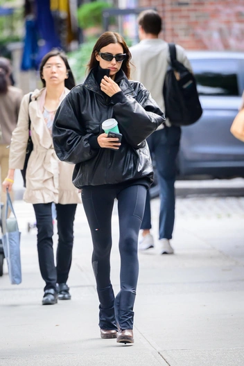 Чаще всего Ирина Шейк любит говорить на языке Balenciaga. В ее гардеробной много широких брюк со спортивными лампасами, футболок с принтами, худи, спортивных костюмов и трендовых кроссовок. Отдельное внимание, как мы говорили, Ирина уделяет очкам: в ее шкафу теперь преобладают спортивные варианты, как для бегового или веломарафона.