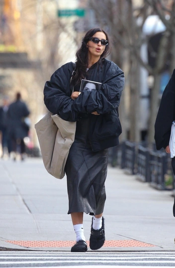 Те же Tabi она стилизует и с простым пуховиком, чтобы разбавить образ. А ее аутфит с футболкой и классической кожаной юбкой дополняют трендовые New Balance и огромная сумка через плечо.