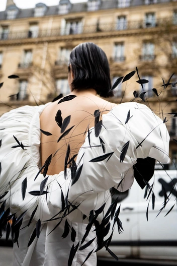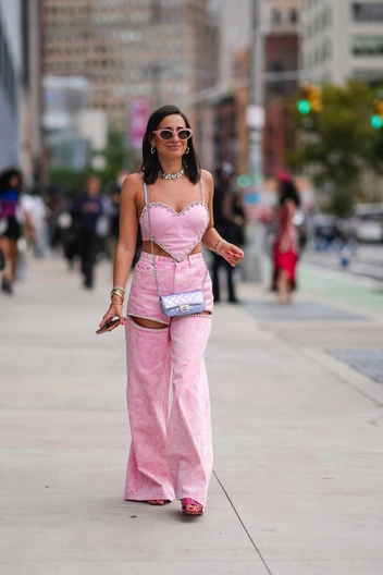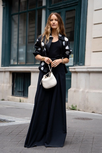 В отличие от симметричных вырезов, он проходит по линии горловины так, что одна часть одежды расположена выше или ниже другой. Это может быть буквально «срезанное» плечо, диагональная линия или сложная геометрическая форма. Асимметрия позволяет создать эффектный и нарядный образ, привлекающий внимание к открытым частям тела, особенно в сочетании с глянцевыми тканями. Если топ сделан из обычной, не блестящей ткани, то можно выбрать вариант с акцентной деталью на плече или талии — так получится создать вечерний образ даже без использования кожи или любого другого блестящего материала.