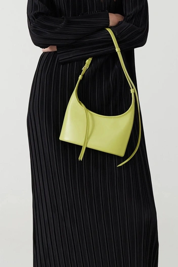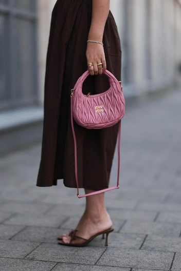 Вообще, платья — это самое идеальное комбо для сумки такой формы. Ее отличает плавный силуэт, а значит она довольно романтична и идеальна для аутфитов на свидание. Летящее платье с оборками в стиле бохо? Полупрозрачное — тренд осени 2025? Платье-пиджак, которое хочется чем-то смягчить, снизив градус серьезности?