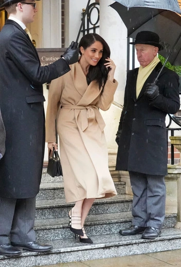 Однако перед официальным уходом из БКС у пары есть еще несколько важных событий, поэтому герцоги ненадолго вернулись в Лондон. В четверг днем папапрацци заприметили Сассексских, выходящих из The Goring, пятизвездочного отеля недалеко от Букингемского дворца. И хотя супруга принца промелькнула всего на несколько минут, ее стильный образ заслуживает особенного внимания. Герцогиня появилась в пальто-халате с шалевым воротником от бренда Alex Eagle, босоножках Aquazzura с жемчужным декором и с классической кожаной сумкой Loewe в размере мини. Пальто выполнено из итальянской шерсти Baby Camel Hair Loro Piana и имеет подкладку из шерсти и пояс в тон.