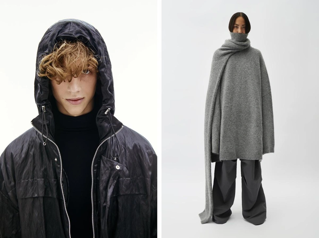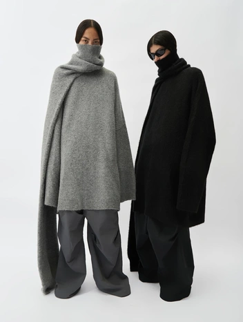 У каждого есть любимая заношенная вещь: достаточно укутаться в нее, чтобы ощутить приятный шлейф воспоминаний и бездонное тепло домашнего уюта. Знаменитый японский бренд, кажется, знает все о магии подобной одежды — и именно поэтому упорно возводит несовершенства в культ. Отсюда причудливый крой, многослойность и намеренно неаккуратные швы в новой коллекции. Русская марка USHATÁVA следует за этой эстетикой — и предлагает нам серый свитер из альпаки, совмещенный с шарфом, как и у Yohji Yamamoto.