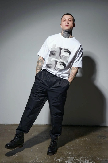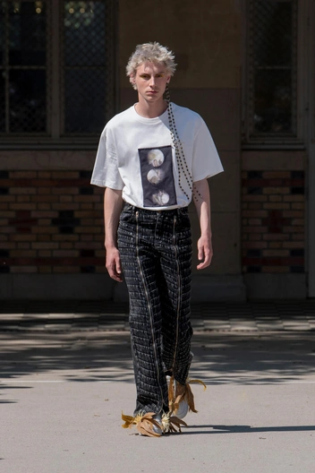 Модная марка китайского происхождения смогла создать по-настоящему весеннюю коллекцию, которая, по признанию самого дизайнера, посвящалась ее бабушке. Рисунок в виде засохших цветов в серовато-черной гамме отсылает нас не только к природному миру, но и к эстетике Y2K. С последней задачей отлично справляется практически идентичная футболка бренда S.T.I.C.H. От Feng Chen Wang ее отличает разве что само содержание рисунка (отечественные дизайнеры оставили такую же цветовую гамму, выбрав иной принт) — но мы не против. Две пары глаз хорошо, а еще несколько — даже лучше!