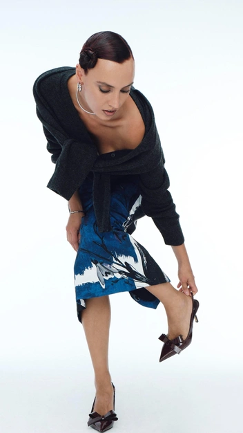 В ее образах нет места банальщине: если юбка — то со смелыми разрезами, если платье — кожаное или прозрачное, а если пиджак — то принтованный. Вот и в коллекции MAAG стилист нашла трендовую юбку с акцентным рисунком, напоминающим полноценную картину в ярких синих тонах.