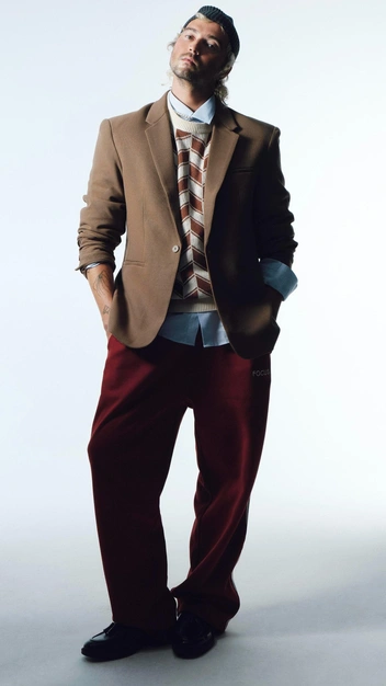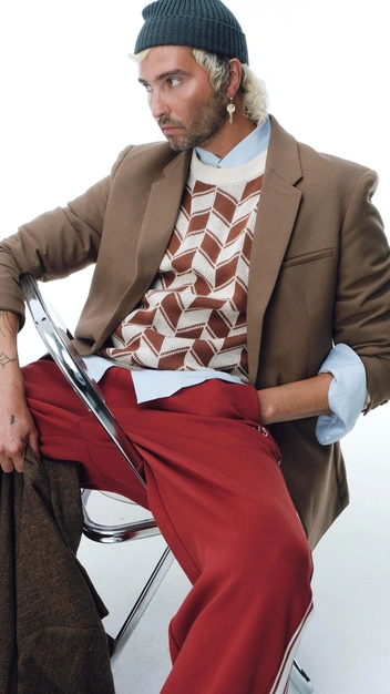 За уют в проекте модного бренда отвечал Китти, который ценит в гардеробе комфорт, расслабленность и возможность с ним экспериментировать. За основу он взял трикотаж — вещи, которые давно перестали ассоциироваться со спортом и домашней одеждой. Еще одна страсть российского стилиста — акцентные цвета, поэтому в его образе представлены широкие красные брюки и принтованный джемпер.