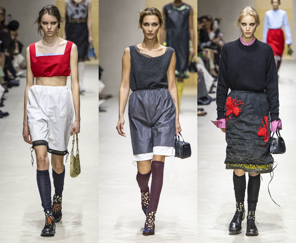 И вот, спустя несколько недель, мы увидели те же мотивы уже на женской Неделе моды. Те же силуэты, тот же стайлинг — и некоторые вещи буквально повторяли мужские, только теперь сидели иначе: мягче, ближе к телу, чувственнее. Миучча будто подчеркнула: «интеллект не имеет гендера, но имеет отличный крой».