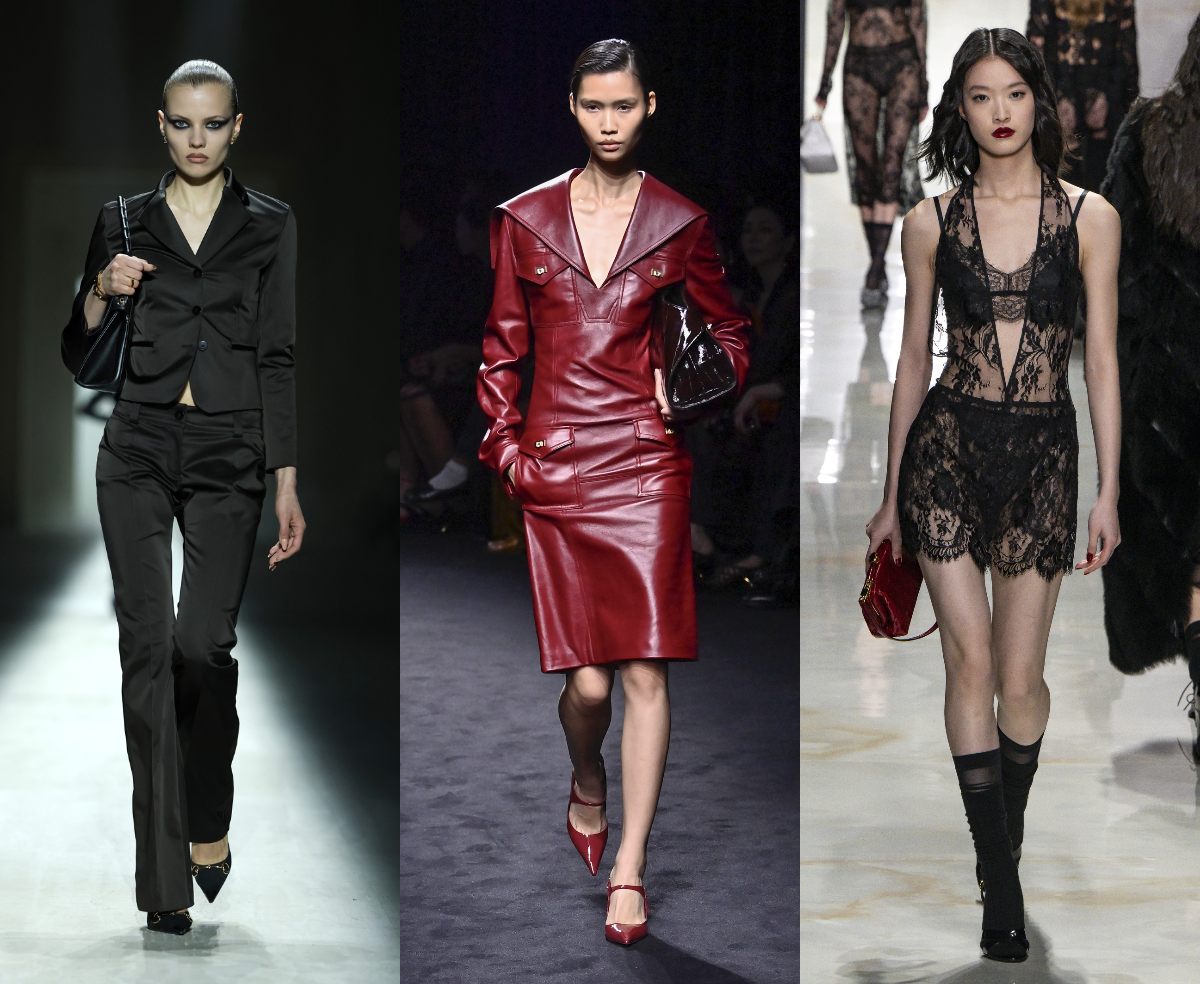 Пальто и жакеты сидят по фигуре, плечи становятся четкими, но не гипертрофированными, талия обозначена, а бедра подчеркнуты. У Ferragamo — платья, которые очерчивают силуэт так, будто их кроили прямо под вас, у Gucci — костюмы, сидящие буквально «в облипку», с низкой посадкой брюк и акцентом на изгибы тела, а у Dolce&Gabbana — снова все внимание на хрупкость женского тела.