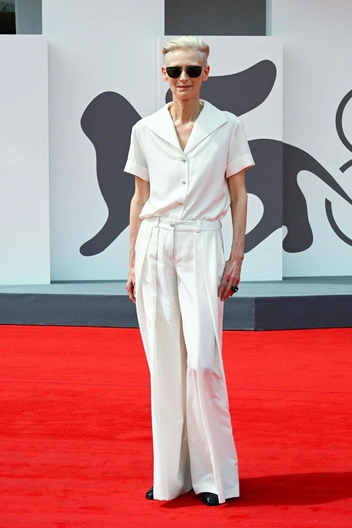 Следом Тильда Суинтон, обычно предпочитающая андрогинный стиль, примерила рубашку с круглым воротом и рукавами с ламбрекенами — это прямой отсыл к баске, тренду из прошлого, который вернулся на показы FW/25-26. А кто как не Тильда знает все про умеренную готику и как правильно ввести ее в образ?