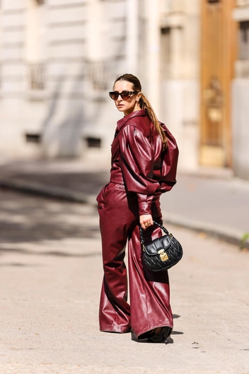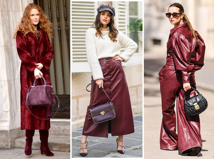 Один из главных трендов 2023 года — кожа, которая прибавляет женщинам чувство уверенности, свободы и сексуальности. Обратите внимание на кожаные юбки и брюки в бордовом оттенке, их стилизуйте с монохромными бадлонами и джемперами, сумками-тоутами и золотыми украшениями.