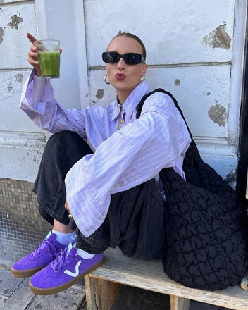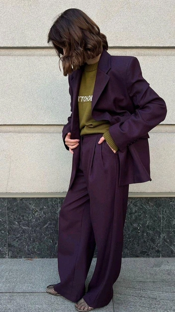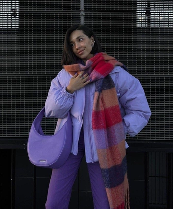 Если вы пока не готовы к total purple образам, предлагаем начать с деталей: шарфа, перчаток, сумки или обуви. Лавандовая шапка или баклажановый ремень уместны в любом стиле — от спорт-шика до минимализма. Такой акцентный аксессуар «разбавляет» будничный образ и придает воздушности даже самому строгому офисному костюму.