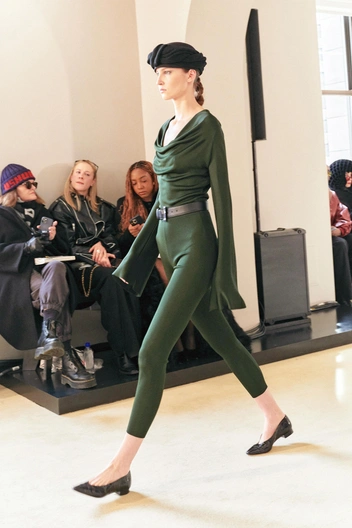 Тут же стоит оговорить и материалы. Модные лосины в 2026 году выполнены не только из классического спортивного спандекса. Точнее, скорее не из него. Гораздо чаще дизайнеры делали выбор в пользу фактурных тканей — меланжа, трикотажа в рубчик или мелкой вязки. А еще добавляли к нему акцентные детали — как Acne Studios, которые снабдили свои легинсы вырезами на коленях.