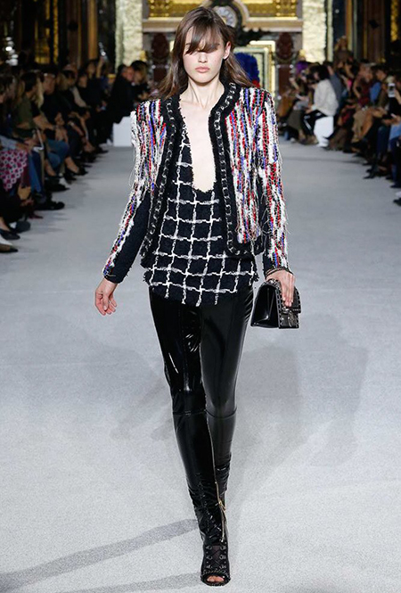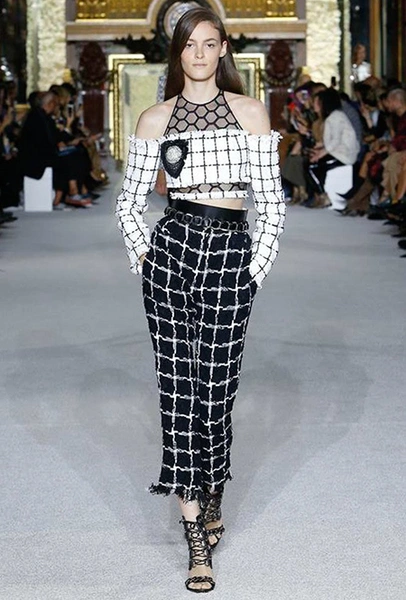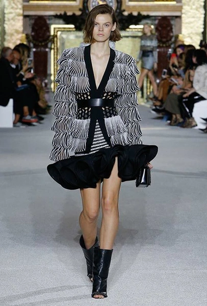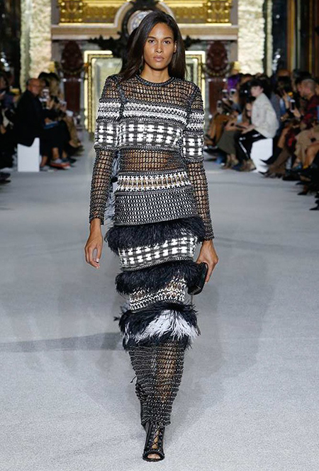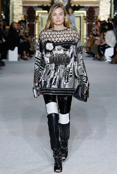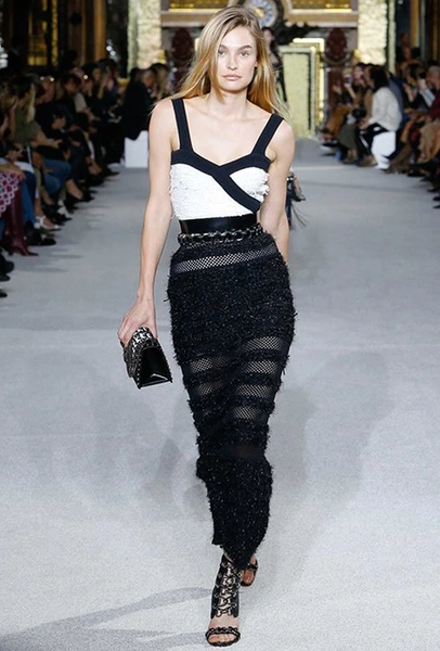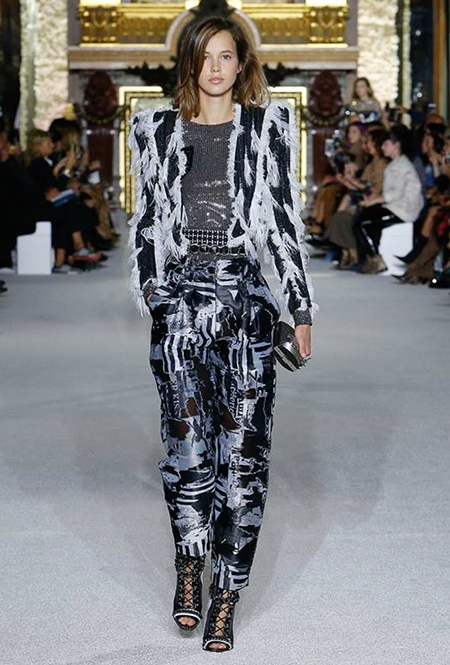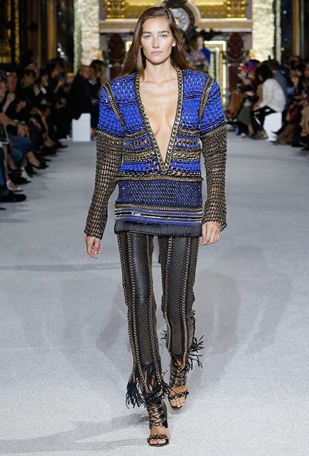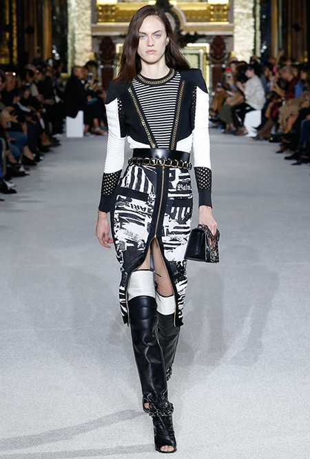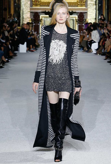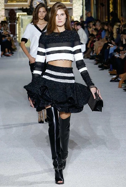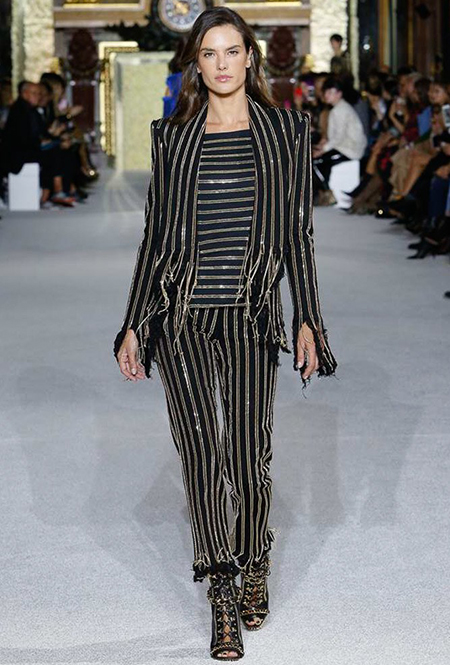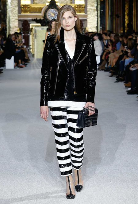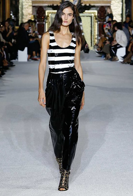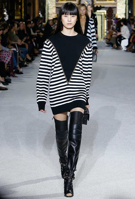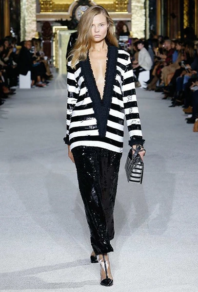 Парижскую тему продолжает самый «французский» принт – полоска. В блоке, посвященном daywear, более сдержанном (если этот эпитет вообще применим к современному Balmain), чем остальная коллекция, «под тельняшки» раскрашены топы, брюки, трикотажное платье и длинный, с глубоким вырезом, свитер.