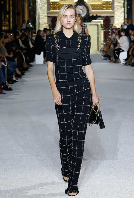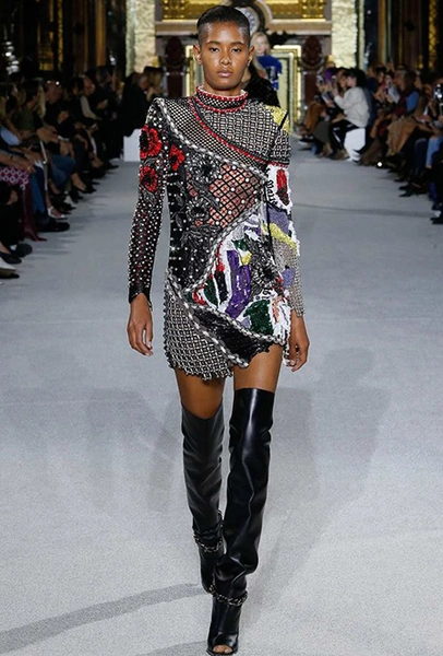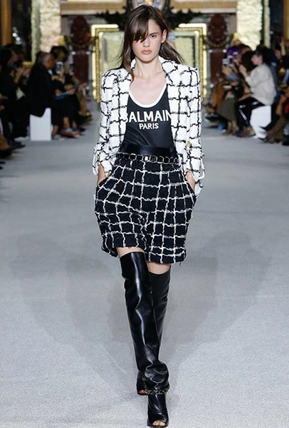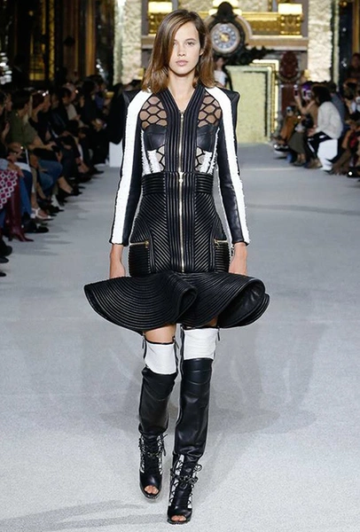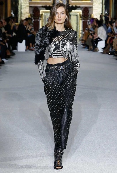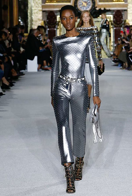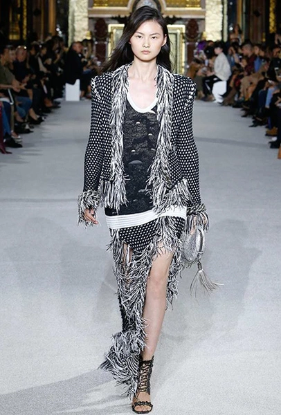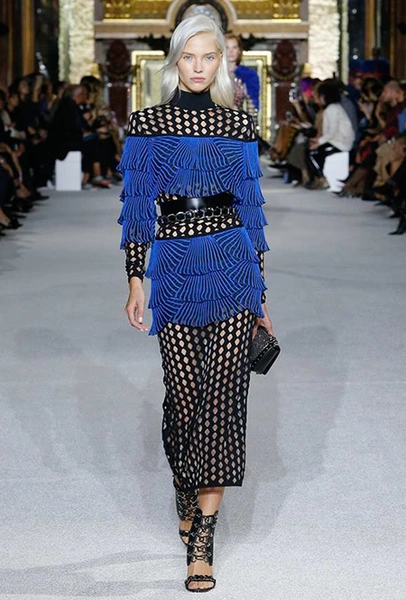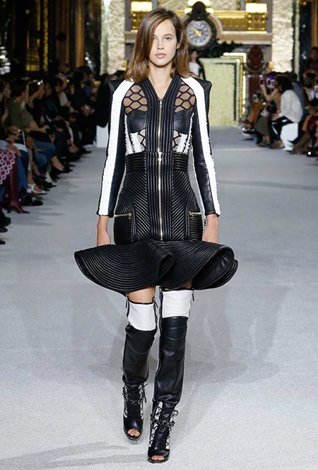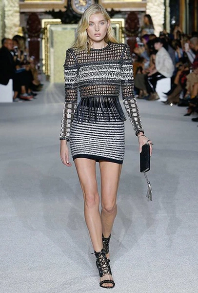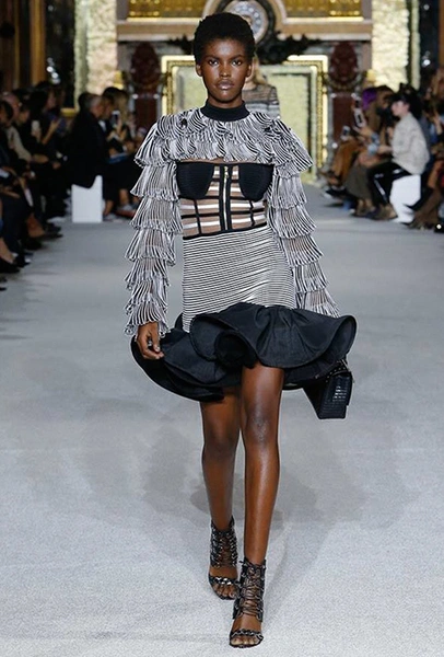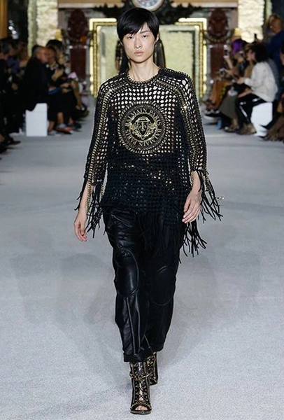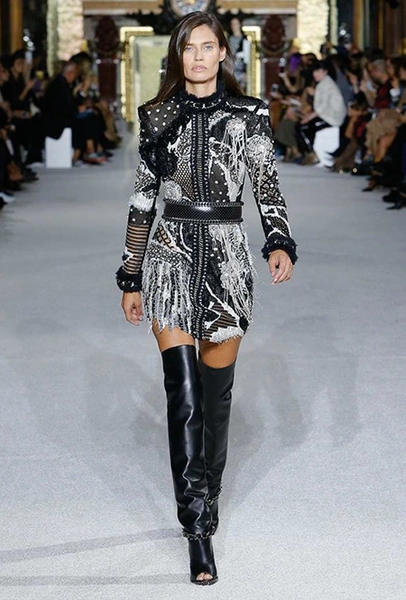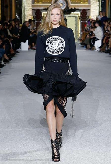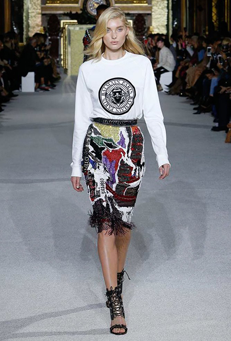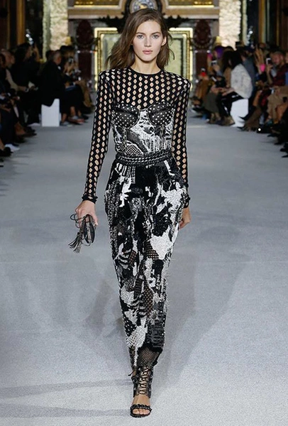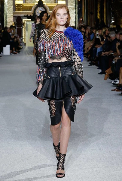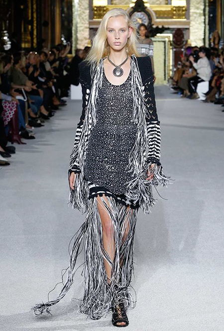 Парижскую тему продолжает самый «французский» принт – полоска. В блоке, посвященном daywear, более сдержанном (если этот эпитет вообще применим к современному Balmain), чем остальная коллекция, «под тельняшки» раскрашены топы, брюки, трикотажное платье и длинный, с глубоким вырезом, свитер.