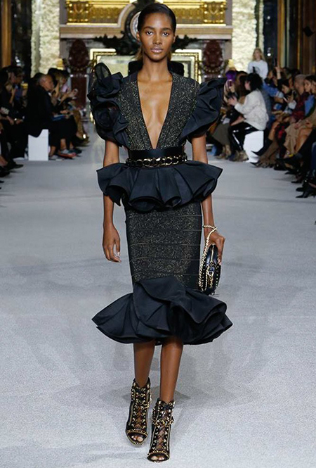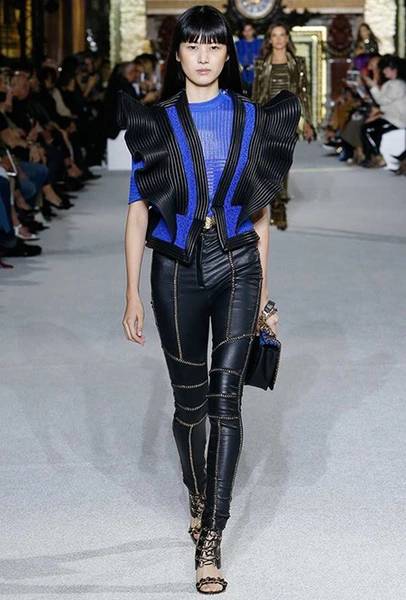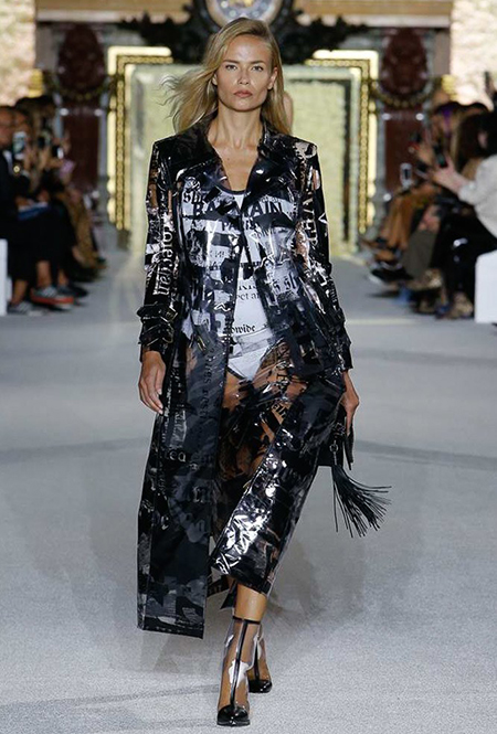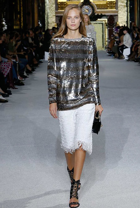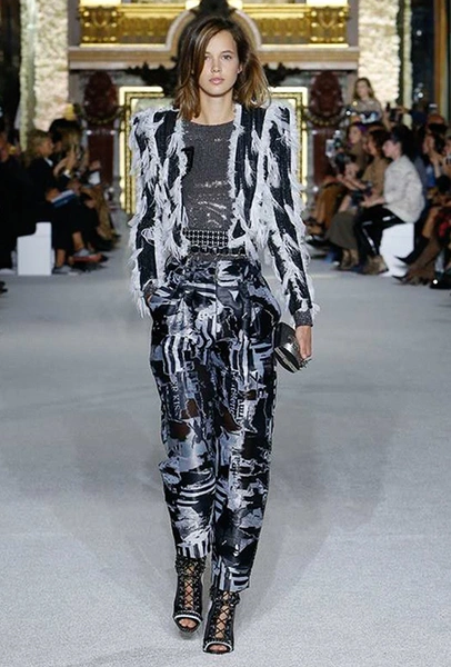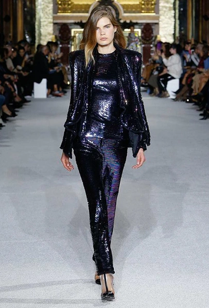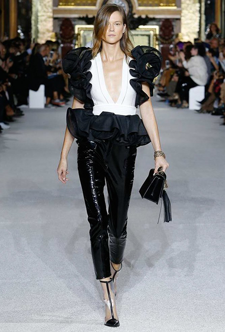 Полны блеска, эксцентрики и динамики и сами вещи. Рустен, который по слухам может вот-вот перейти в Versace, дом, олицетворяющий роскошную чрезмерность, остается верен себе. Он обожает графичные, объемные силуэты в стиле сверкающих 80-х – у платьев и жакетов широкие, угловатые плечи. Любит пестрый принт и блестящую отделку – здесь есть и наряды из серебристых и фиолетовых пайеток и топы и брюки из лакированной кожи. И, словно всего этого великолепия недостаточно, чтобы оглушить неподготовленного зрителя, неутомимый Оливье добавляет еще и пышные воланы.