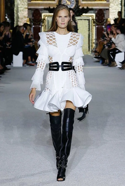 Тем, кто пока не решился на ботфорты, Рустен предлагает босоножки и ботильоны. Последние либо однотонные без мыска, либо прозрачные с контрастными носами и черными полосами посередине – в сочетании с платьями, чей лиф состоит из черных, белых, прозрачных вставок, они отлично подчеркивают графичность всего образа.