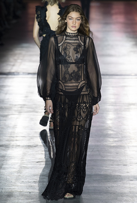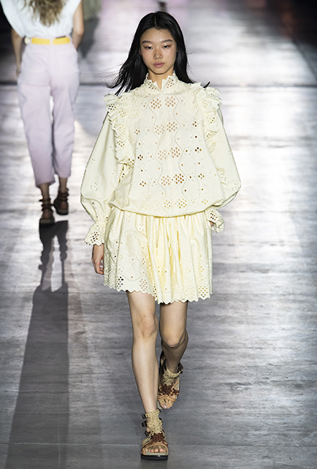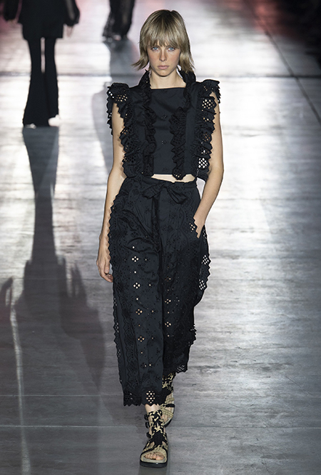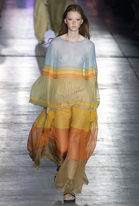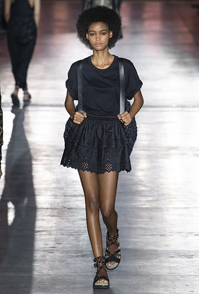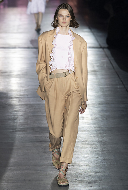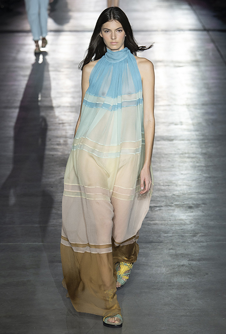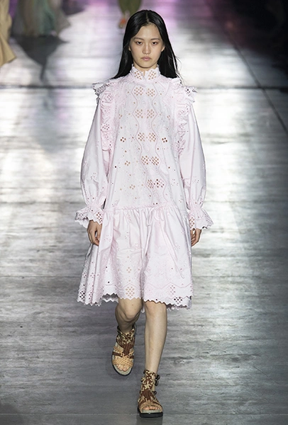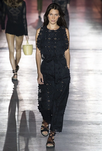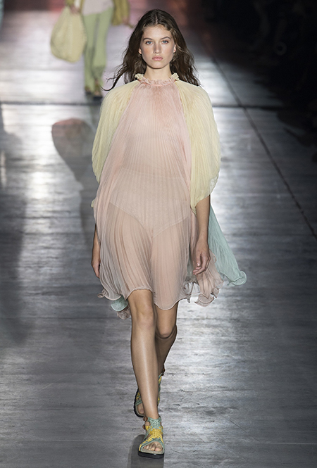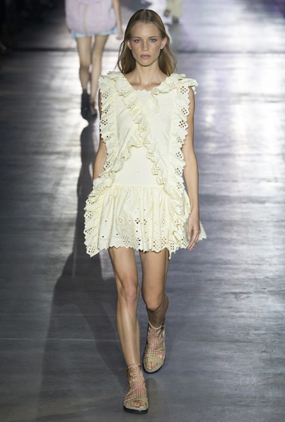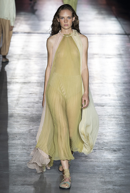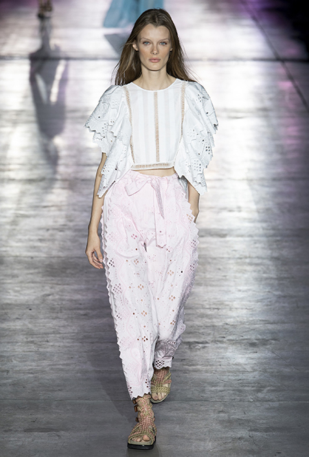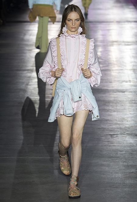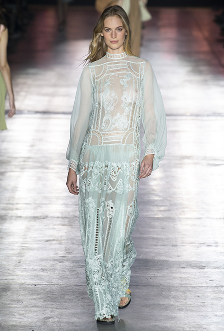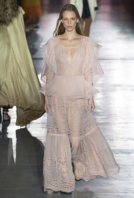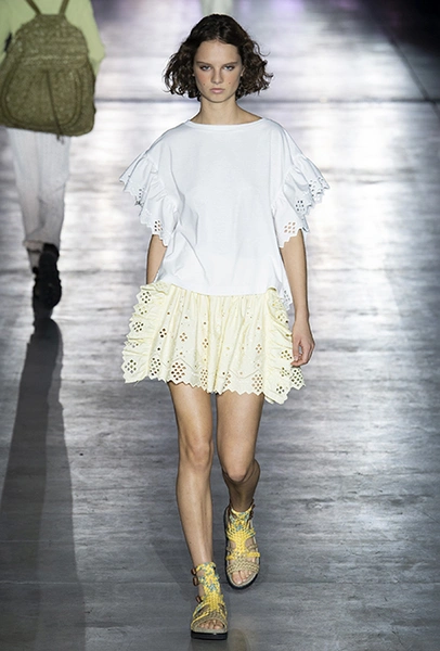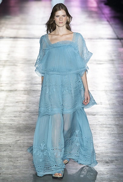 «В коллекции я хотела показать новый подход, через который женщины могут выражать себя при помощи невинности, мягкости и почти мечтательного спокойствия», — рассказала дизайнер Альберта Ферретти после показа. Настроение ее новой весенне-летней коллекции и правда идет вразрез со ставшими уже привычными стилями и последними модными направлениями: athleisure с их гипертрофированными куртками и худи, power dressing и маскулинные фасоны костюмов уже обыграли многие бренды.