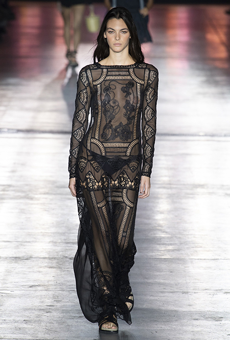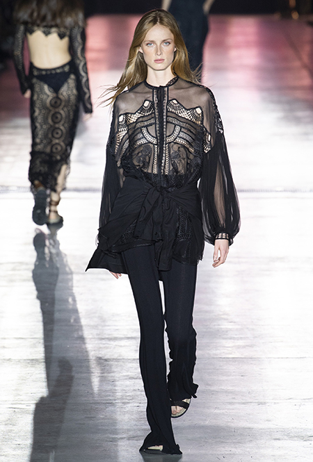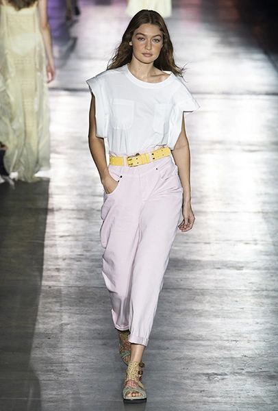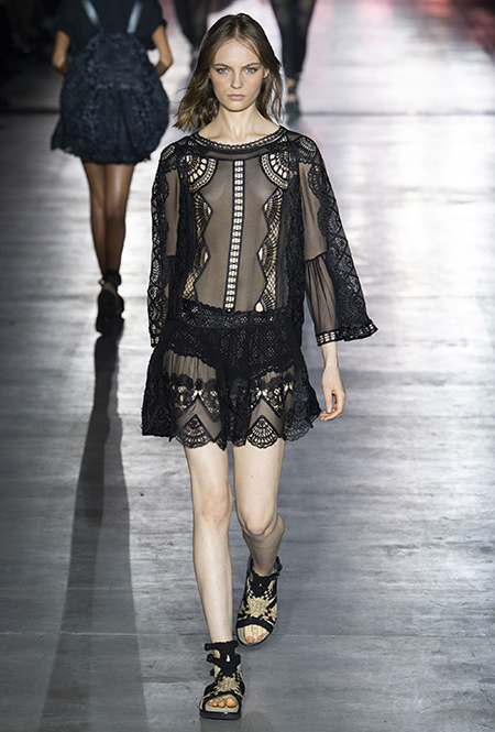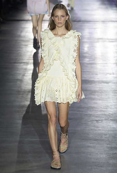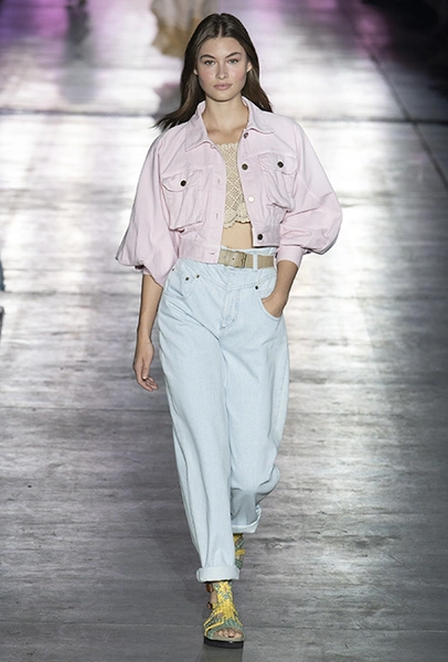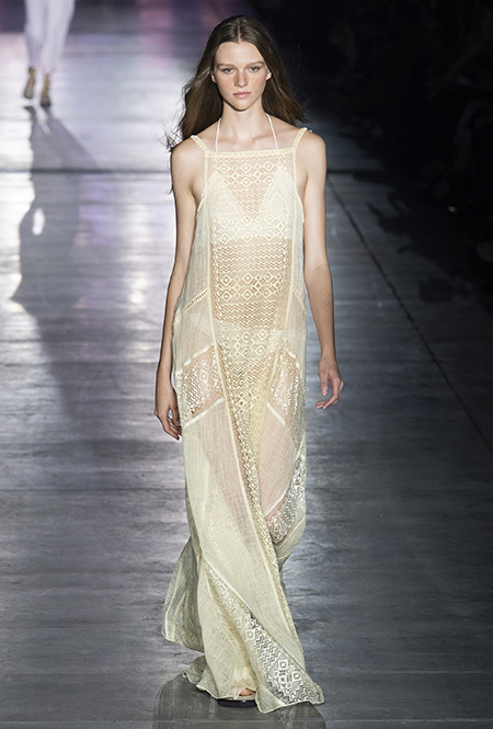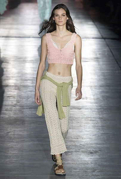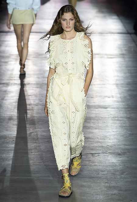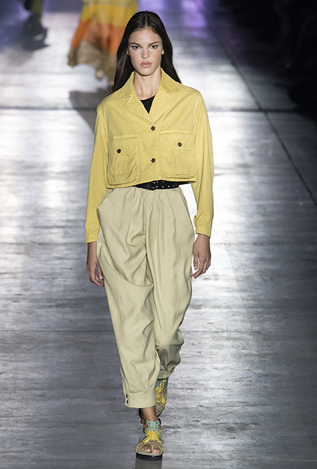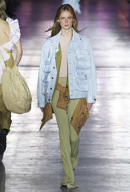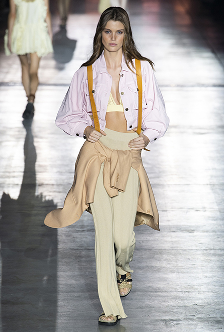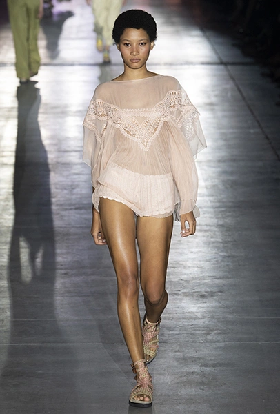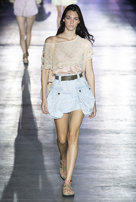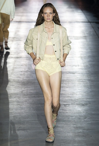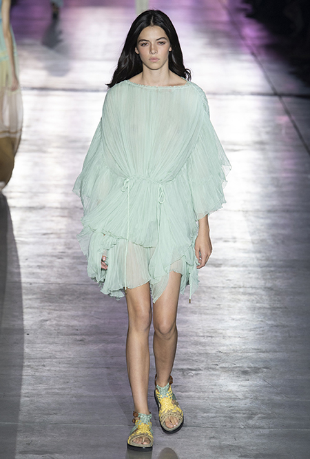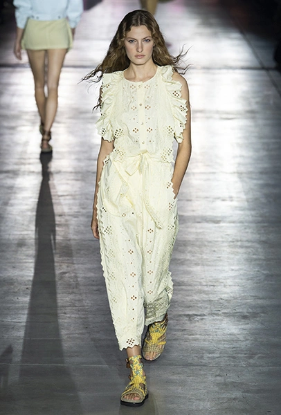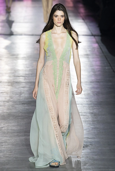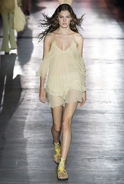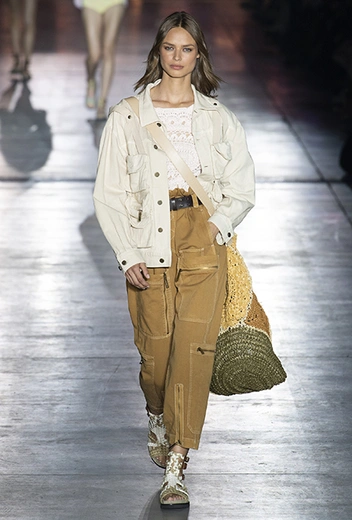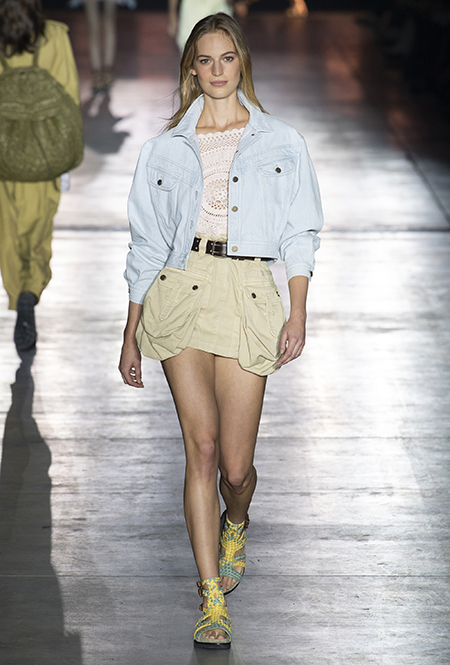 Без заимствования предметов мужского гардероба в коллекции Феретти также не обошлось, но теперь она решает добавить им немного женственности и показать современную интерпретацию бохо и сафари. Ансамбли из объемных шорт и юбок с карманами, джинсовые куртки, рубашки без рукавов, шелковые топы и платья-комбинации, и все это — в приглушенной гамме: кремовом, нежно-голубом, бледно-розовом и натуральных оттенках хаки, песка и камня.