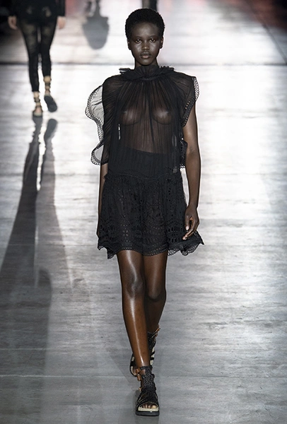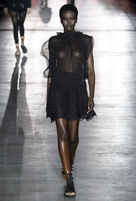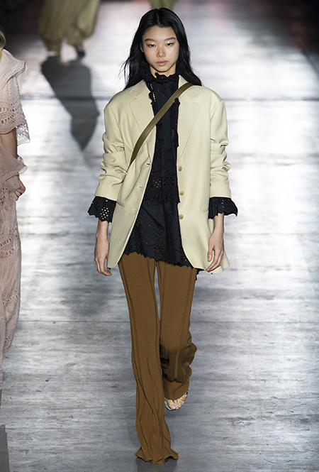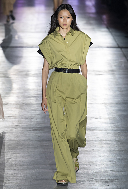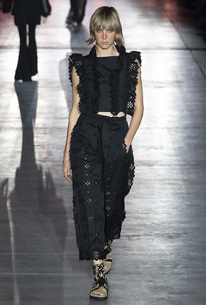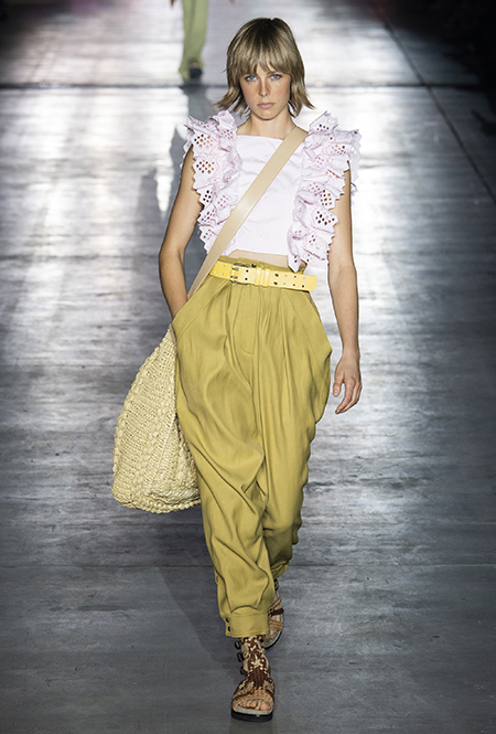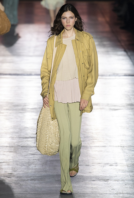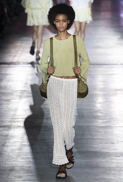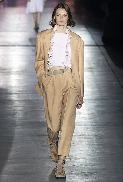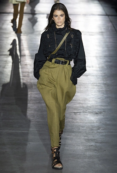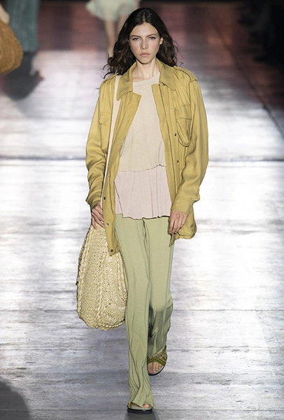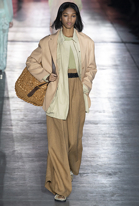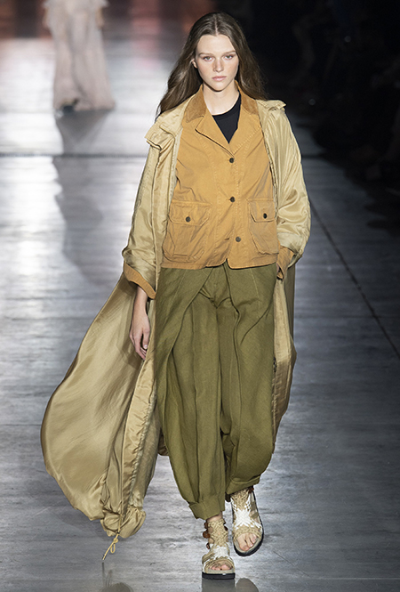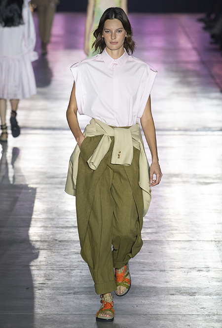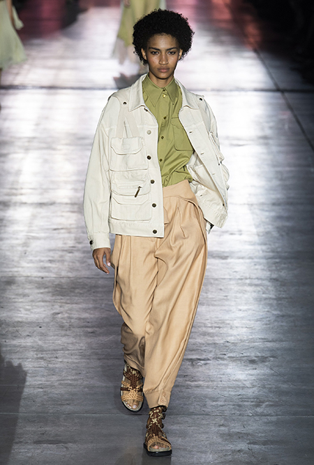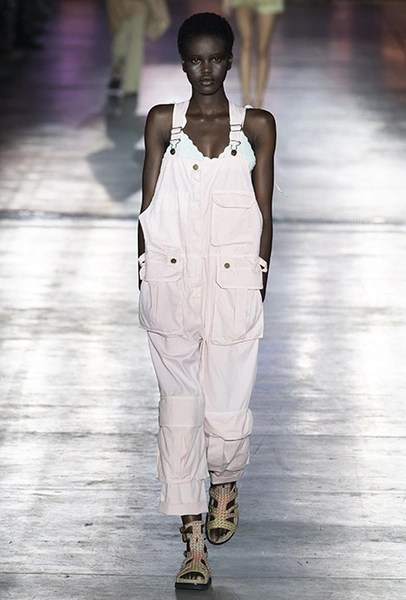 Однако и без ультратрендовых новинок, которые совсем скоро заполонят магазины, тоже не обошлось — например, свободные брюки карго с объемными накладными карманами заявили о своем триумфальном возвращении еще в прошлом сезоне и теперь все чаще появляются в коллекциях самых передовых дизайнеров, тонко чувствующих актуальные тенденции. У Альберты Ферретти они не стали коммерческим вкраплением, а органично вписались в канву показа с их свободными силуэтами, рубашками в стиле сафари и спецодеждой цвета хаки.