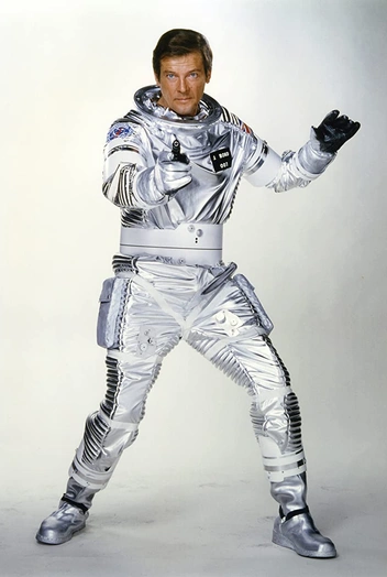 За всю историю Джеймс Бонд успел побывать везде, в том числе и в космосе. В фильме 1979 года «Лунный гонщик» Бонд, роль которого исполнил Роджер Мур, пробирается на космический шаттл, чтобы помешать главному злодею Драксу устроить на Земле апокалипсис. В кадре агент предстает в футуристическом серебряном костюме с нашивкой британского флага, созданном художником по костюмам Жаком Фонтере.