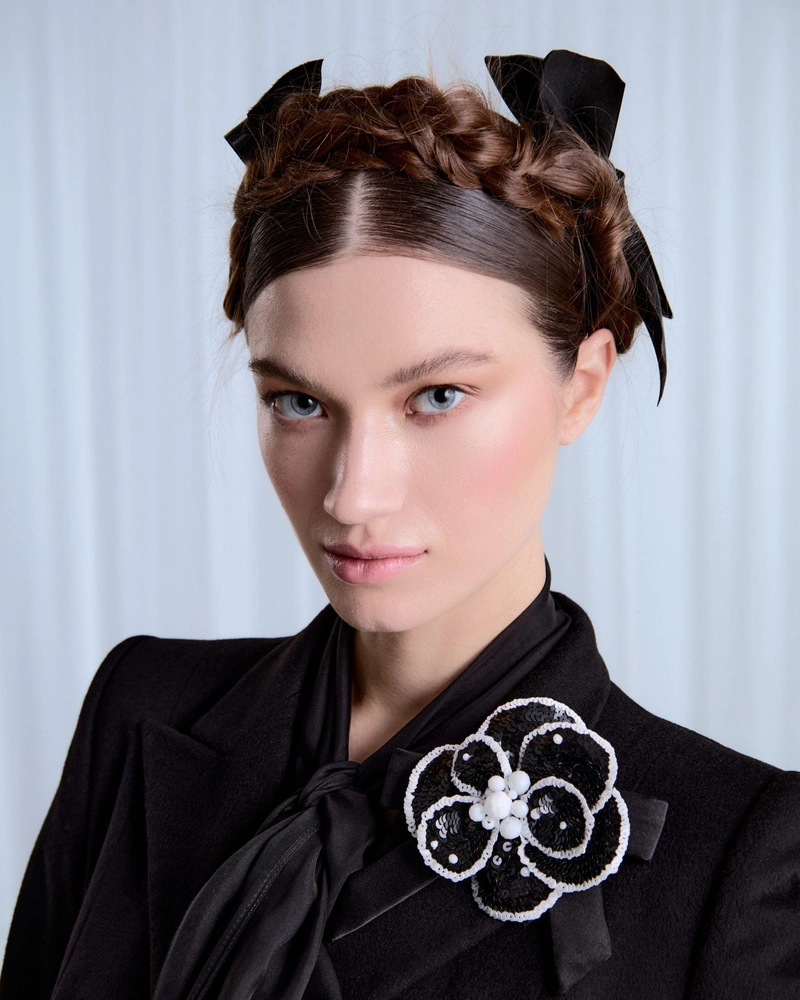 У стиля есть конкретные фавориты: вечерние платья, классические и нарядные жакеты, черную юбку в пол, удлиненные рубашки с авторской вышивкой и декором ручной работы. В каждой модели коллекции «Габриэль» интегрированы кутюрные коды и детали, характерные для образа той самой Шанель: сочетание матовых и глянцевых фактур, брошь-камелия, многослойные жемчужные нити, шифоновые ленты, колосистая отстрочка на жакетах — символ успеха и уверенности в себе.