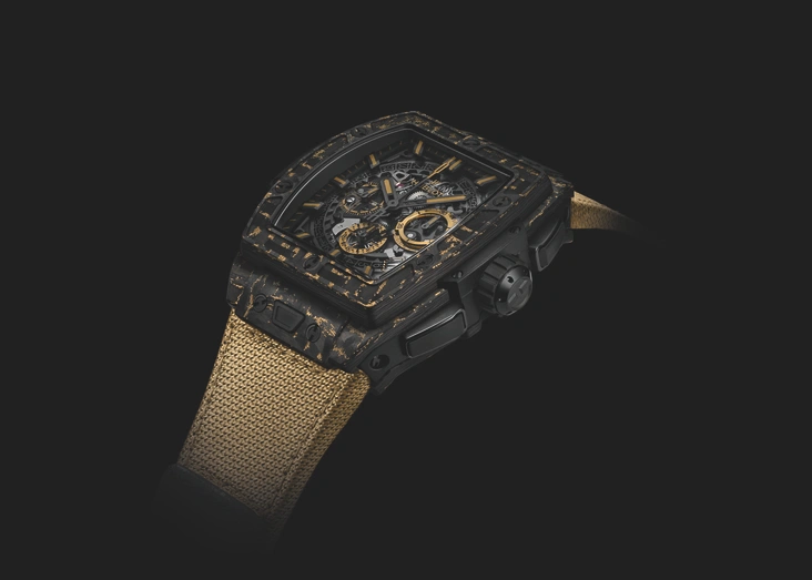 Швейцарская мануфактура всего во второй раз объединяет черный и золотой материалы для создания своих часов, в результате чего образуются необычные узоры на корпусе. Эффект мерцающего и переливающегося покрытия достигается благодаря сочетанию драгоценного металла и углеродного волокна.